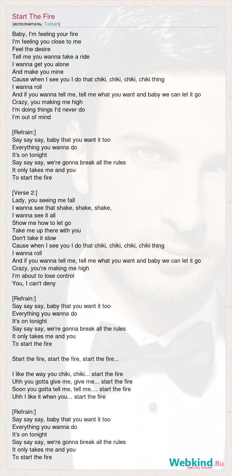 Baby, I'm feeling your fire I'm feeling you close to me Feel the desire Tell me you wanna take a ride I wanna get you alone And make you mine Cause when I see you I do that chiki, chiki, chiki, chiki thing I wanna roll And if you wanna tell me, tell me what you want and baby we can let it go Crazy, you making me high I'm doing things I'd never do I'm out of mind [Refrain:] Say say say, baby that you want it too Everything you wanna do It's on tonight Say say say, we're gonna break all the rules It only takes me and you To start the fire [Verse 2:] Lady, you seeing me fall I wanna see that shake, shake, shake, I wanna see it all Show me how to let go Take me up there with you Don't take it slow Cause when I see you I do that chiki, chiki, chiki, chiki thing I wanna roll And if you wanna tell me, tell me what you want and baby we can let it go Crazy, you're making me high I'm about to lose control You, I can't deny [Refrain:] Say say say, baby that you want it too Everything you wanna do It's on tonight Say say say, we're gonna break all the rules It only takes me and you To start the fire Start the fire, start the fire, start the fire... I like the way you chiki, chiki... start the fire Uhh you gotta give me, give me... start the fire Soon you gotta tell me, tell me.... start the fire Uhh I like it when you... start the fire [Refrain:] Say say say, baby that you want it too Everything you wanna do It's on tonight Say say say, we're gonna break all the rules It only takes me and you To start the fire