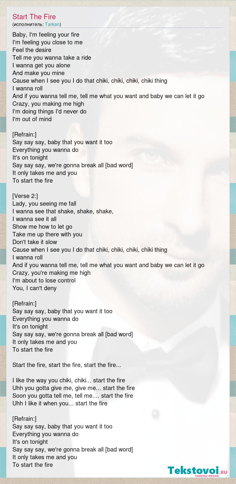 Baby, I'm feeling your fire I'm feeling you close to me Feel the desire Tell me you wanna take a ride I wanna get you alone And make you mine Cause when I see you I do that chiki, chiki, chiki, chiki thing I wanna roll And if you wanna tell me, tell me what you want and baby we can let it go Crazy, you making me high I'm doing things I'd never do I'm out of mind [Refrain:] Say say say, baby that you want it too Everything you wanna do It's on tonight Say say say, we're gonna break all the rules It only takes me and you To start the fire [Verse 2:] Lady, you seeing me fall I wanna see that shake, shake, shake, I wanna see it all Show me how to let go Take me up there with you Don't take it slow Cause when I see you I do that chiki, chiki, chiki, chiki thing I wanna roll And if you wanna tell me, tell me what you want and baby we can let it go Crazy, you're making me high I'm about to lose control You, I can't deny [Refrain:] Say say say, baby that you want it too Everything you wanna do It's on tonight Say say say, we're gonna break all the rules It only takes me and you To start the fire Start the fire, start the fire, start the fire... I like the way you chiki, chiki... start the fire Uhh you gotta give me, give me... start the fire Soon you gotta tell me, tell me.... start the fire Uhh I like it when you... start the fire [Refrain:] Say say say, baby that you want it too Everything you wanna do It's on tonight Say say say, we're gonna break all the rules It only takes me and you To start the fire
