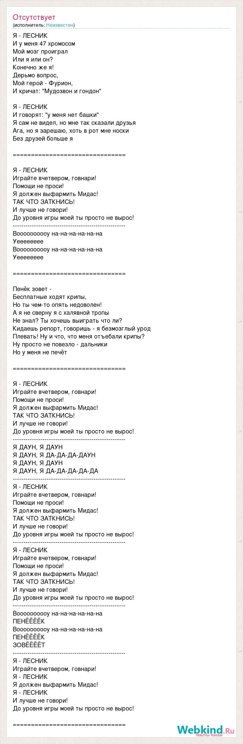 Я - ЛЕСНИК И у меня 47 хромосом Мой мозг проиграл Или я или он? Конечно же я! Дерьмо вопрос, Мой герой - Фурион, И кричат: "Мудозвон и гондон" Я - ЛЕСНИК И говорят: "у меня нет башки" Я сам не видел, но мне так сказали друзья Ага, но я зарешаю, хоть в рот мне носки Без друзей больше я =============================== Я - ЛЕСНИК Играйте вчетвером, говнари! Помощи не проси! Я должен выфармить Мидас! ТАК ЧТО ЗАТКНИСЬ! И лучше не говори! До уровня игры моей ты просто не вырос! ----------------------------------------------------- Воооооооооу на-на-на-на-на-на Уееееееее Воооооооооу на-на-на-на-на-на Уееееееее =============================== Пенёк зовет - Бесплатные ходят крипы, Но ты чем-то опять недоволен! А я не сверну я с халявной тропы Не знал? Ты хочешь выиграть что ли? Кидаешь репорт, говоришь - я безмозглый урод Плевать! Ну и что, что меня отъебали крипы? Ну просто не повезло - дальники Но у меня не печёт =============================== Я - ЛЕСНИК Играйте вчетвером, говнари! Помощи не проси! Я должен выфармить Мидас! ТАК ЧТО ЗАТКНИСЬ! И лучше не говори! До уровня игры моей ты просто не вырос! ----------------------------------------------------- Я ДАУН, Я ДАУН Я ДАУН, Я ДА-ДА-ДА-ДАУН Я ДАУН, Я ДАУН Я ДАУН, Я ДА-ДА-ДА-ДА-ДА ----------------------------------------------------- Я - ЛЕСНИК Играйте вчетвером, говнари! Помощи не проси! Я должен выфармить Мидас! ТАК ЧТО ЗАТКНИСЬ! И лучше не говори! До уровня игры моей ты просто не вырос! ----------------------------------------------------- Я - ЛЕСНИК Играйте вчетвером, говнари! Помощи не проси! Я должен выфармить Мидас! ТАК ЧТО ЗАТКНИСЬ! И лучше не говори! До уровня игры моей ты просто не вырос! ----------------------------------------------------- Воооооооооу на-на-на-на-на-на ПЕНЁЁЁЁК Воооооооооу на-на-на-на-на-на ПЕНЁЁЁЁК ЗОВЁЁЁЁТ ----------------------------------------------------- Я - ЛЕСНИК Играйте вчетвером, говнари! Я - ЛЕСНИК Я должен выфармить Мидас! Я - ЛЕСНИК И лучше не говори! До уровня игры моей ты просто не вырос! ===============================