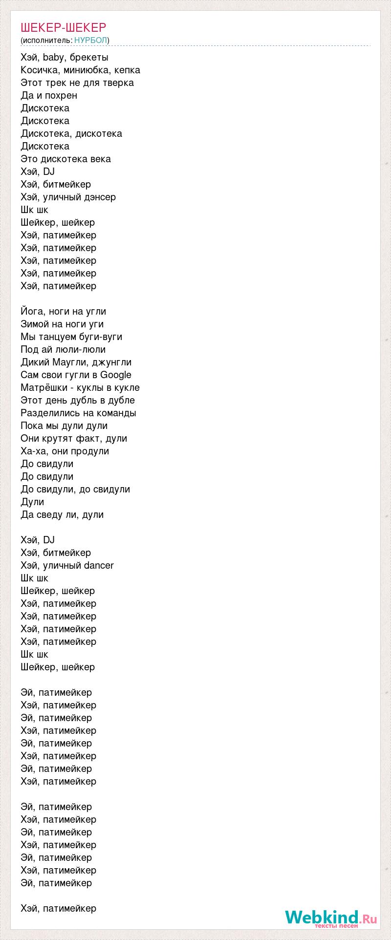 Хэй, baby, брекеты Косичка, миниюбка, кепка Этот трек не для тверка Да и похрен Дискотека Дискотека Дискотека, дискотека Дискотека Это дискотека века Хэй, DJ Хэй, битмейкер Хэй, уличный дэнсер Шк шк Шейкер, шейкер Хэй, патимейкер Хэй, патимейкер Хэй, патимейкер Хэй, патимейкер Хэй, патимейкер Йога, ноги на угли Зимой на ноги уги Мы танцуем буги-вуги Под ай люли-люли Дикий Маугли, джунгли Сам свои гугли в Google Матрёшки - куклы в кукле Этот день дубль в дубле Разделились на команды Пока мы дули дули Они крутят факт, дули Ха-ха, они продули До свидули До свидули До свидули, до свидули Дули Да сведу ли, дули Хэй, DJ Хэй, битмейкер Хэй, уличный dancer Шк шк Шейкер, шейкер Хэй, патимейкер Хэй, патимейкер Хэй, патимейкер Хэй, патимейкер Шк шк Шейкер, шейкер Эй, патимейкер Хэй, патимейкер Эй, патимейкер Хэй, патимейкер Эй, патимейкер Хэй, патимейкер Эй, патимейкер Хэй, патимейкер Эй, патимейкер Хэй, патимейкер Эй, патимейкер Хэй, патимейкер Эй, патимейкер Хэй, патимейкер Эй, патимейкер Хэй, патимейкер