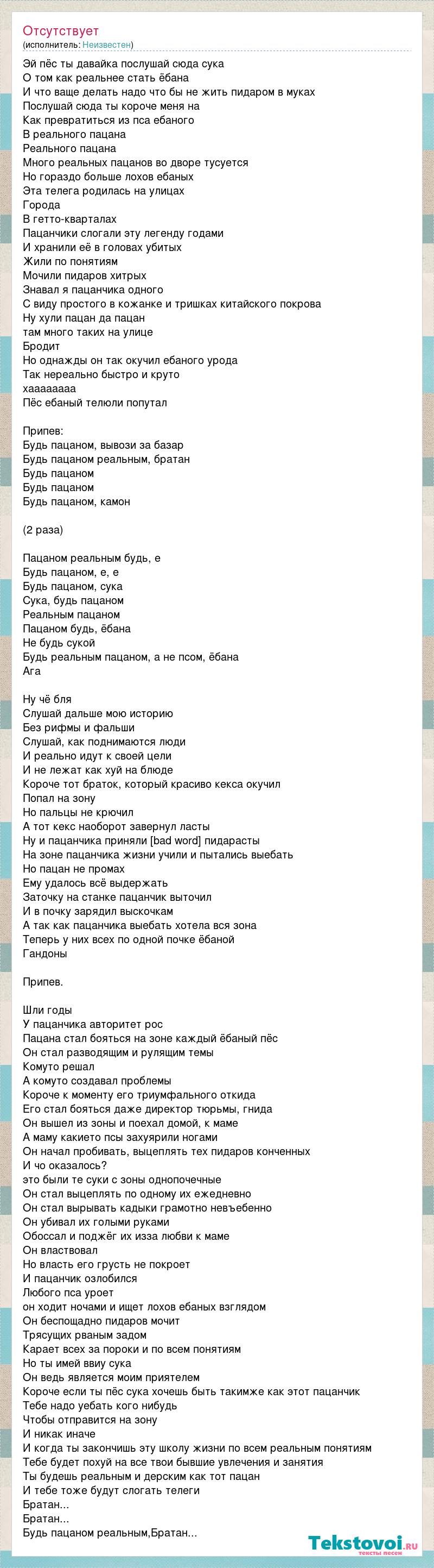 Эй пёс ты давайка послушай сюда сука О том как реальнее стать ёбана И что ваще делать надо что бы не жить пидаром в муках Послушай сюда ты короче меня на Как превратиться из пса ебаного В реального пацана Реального пацана Много реальных пацанов во дворе тусуется Но гораздо больше лохов ебаных Эта телега родилась на улицах Города В гетто-кварталах Пацанчики слогали эту легенду годами И хранили её в головах убитых Жили по понятиям Мочили пидаров хитрых Знавал я пацанчика одного С виду простого в кожанке и тришках китайского покрова Ну хули пацан да пацан там много таких на улице Бродит Но однажды он так окучил ебаного урода Так нереально быстро и круто хаааааааа Пёс ебаный телюли попутал Припев: Будь пацаном, вывози за базар Будь пацаном реальным, братан Будь пацаном Будь пацаном Будь пацаном, камон (2 раза) Пацаном реальным будь, е Будь пацаном, е, е Будь пацаном, сука Сука, будь пацаном Реальным пацаном Пацаном будь, ёбана Не будь сукой Будь реальным пацаном, а не псом, ёбана Ага Ну чё бля Слушай дальше мою историю Без рифмы и фальши Слушай, как поднимаются люди И реально идут к своей цели И не лежат как хуй на блюде Короче тот браток, который красиво кекса окучил Попал на зону Но пальцы не крючил А тот кекс наоборот завернул ласты Ну и пацанчика приняли [bad word] пидарасты На зоне пацанчика жизни учили и пытались выебать Но пацан не промах Ему удалось всё выдержать Заточку на станке пацанчик выточил И в почку зарядил выскочкам А так как пацанчика выебать хотела вся зона Теперь у них всех по одной почке ёбаной Гандоны Припев. Шли годы У пацанчика авторитет рос Пацана стал бояться на зоне каждый ёбаный пёс Он стал разводящим и рулящим темы Комуто решал А комуто создавал проблемы Короче к моменту его триумфального откида Его стал бояться даже директор тюрьмы, гнида Он вышел из зоны и поехал домой, к маме А маму какието псы захуярили ногами Он начал пробивать, выцеплять тех пидаров конченных И чо оказалось? это были те суки с зоны однопочечные Он стал выцеплять по одному их ежедневно Он стал вырывать кадыки грамотно невъебенно Он убивал их голыми руками Обоссал и поджёг их изза любви к маме Он властвовал Но власть его грусть не покроет И пацанчик озлобился Любого пса уроет он ходит ночами и ищет лохов ебаных взглядом Он беспощадно пидаров мочит Трясущих рваным задом Карает всех за пороки и по всем понятиям Но ты имей ввиу сука Он ведь является моим приятелем Короче если ты пёс сука хочешь быть такимже как этот пацанчик Тебе надо уебать кого нибудь Чтобы отправится на зону И никак иначе И когда ты закончишь эту школу жизни по всем реальным понятиям Тебе будет похуй на все твои бывшие увлечения и занятия Ты будешь реальным и дерским как тот пацан И тебе тоже будут слогать телеги Братан... Братан... Будь пацаном реальным,Братан...