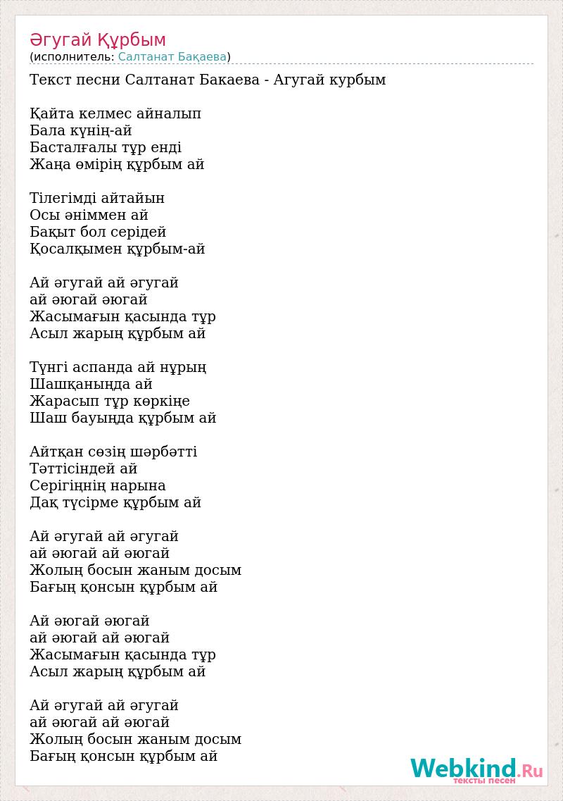 Текст песни Салтанат Бакаева - Агугай курбым Қайта келмес айналып Бала күнің-ай Басталғалы тұр енді Жаңа өмірің құрбым ай Тілегімді айтайын Осы әніммен ай Бақыт бол серідей Қосалқымен құрбым-ай Ай әгугай ай әгугай ай әюгай әюгай Жасымағын қасында тұр Асыл жарың құрбым ай Түнгі аспанда ай нұрың Шашқаныңда ай Жарасып тұр көркіңе Шаш бауыңда құрбым ай Айтқан сөзің шәрбәтті Тәттісіндей ай Серігіңнің нарына Дақ түсірме құрбым ай Ай әгугай ай әгугай ай әюгай ай әюгай Жолың босын жаным досым Бағың қонсын құрбым ай Ай әюгай әюгай ай әюгай ай әюгай Жасымағын қасында тұр Асыл жарың құрбым ай Ай әгугай ай әгугай ай әюгай ай әюгай Жолың босын жаным досым Бағың қонсын құрбым ай