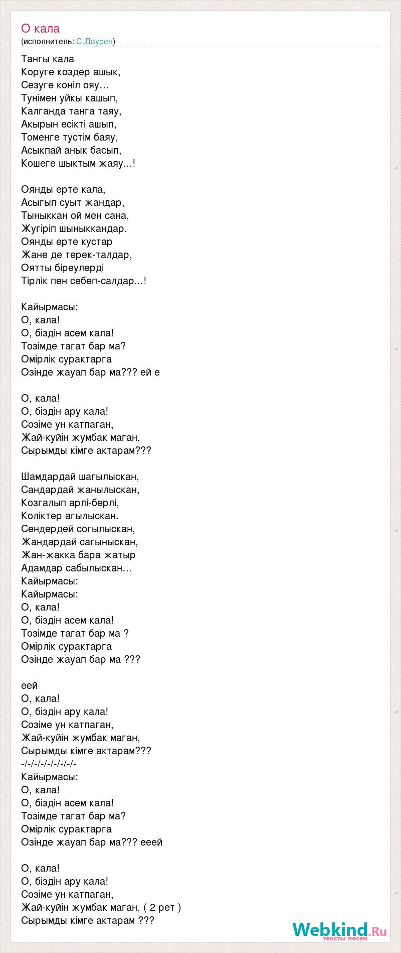 Тангы кала Коруге коздер ашык, Сезуге коніл ояу… Тунімен уйкы кашып, Калганда танга таяу, Акырын есікті ашып, Томенге тустім баяу, Асыкпай анык басып, Кошеге шыктым жаяу...! Оянды ерте кала, Aсыгып суыт жандар, Тыныккан ой мен сана, Жугіріп шыныккандар. Оянды ерте кустар Жане де терек-талдар, Оятты біреулерді Тірлік пен себеп-салдар...! Кайырмасы: О, кала! О, біздін асем кала! Тозімде тагат бар ма? Омірлік сурактарга Озінде жауап бар ма??? ей е О, кала! О, біздін ару кала! Созіме ун катпаган, Жай-куйін жумбак маган, Сырымды кімге актарам??? Шамдардай шагылыскан, Сандардай жанылыскан, Козгалып арлі-берлі, Коліктер агылыскан. Сендердей согылыскан, Жандардай сагыныскан, Жан-жакка бара жатыр Адамдар сабылыскан… Кайырмасы: Кайырмасы: О, кала! О, біздін асем кала! Тозімде тагат бар ма ? Омірлік сурактарга Озінде жауап бар ма ??? еей О, кала! О, біздін ару кала! Созіме ун катпаган, Жай-куйін жумбак маган, Сырымды кімге актарам??? -/-/-/-/-/-/-/-/- Кайырмасы: О, кала! О, біздін асем кала! Тозімде тагат бар ма? Омірлік сурактарга Озінде жауап бар ма??? ееей О, кала! О, біздін ару кала! Созіме ун катпаган, Жай-куйін жумбак маган, ( 2 рет ) Сырымды кімге актарам ???