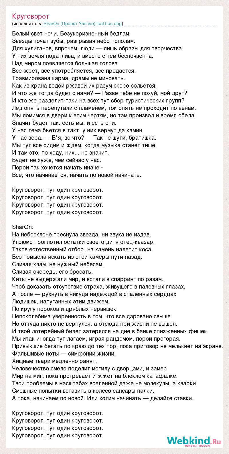 Белый свет ночи. Безукоризненный бедлам. Звезды точат зубы, разгрызая небо пополам. Для хулиганов, впрочем, люди — лишь образы для творчества. У них земля податлива, и вместе с тем беспочвенна. Над миром появляется большая голова. Все жрет, все употребляется, все продается. Травмирована карма, драмы не миновать. Как из крана водой ржавой их разум скоро сольется. И что же тогда будет с нами? — Разве тебе не похуй, мой друг? И кто же разделит-таки на всех тут сбор туристических групп? Лед опять перепутали с пламенем, ток опять не проходит по венам. Мы ломимся в двери к этим чертям, но там произвол и время обеда. Значит будет так: есть мы, и есть они. У нас тема бьется в такт, у них вермут да камин. У нас вера. — Б*я, во что? — Так не шути, братишка. Мы тут все сидим и ждем, когда музыка станет тише. И там это, по ходу, них... не значит. Будет не хуже, чем сейчас у нас. Порой так хочется начать иначе - Все, что начинается, начать по новой начинать. Круговорот, тут один круговорот. Круговорот, тут один круговорот. Круговорот, тут один круговорот. Круговорот, тут один круговорот. SharOn: На небосклоне треснула звезда, ни звука не издав. Угрюмо проглотил остатки своего дитя отец-квазар. Таков естественный отбор, на камень налетит коса. Без помысла искать из этой камеры пути назад. Сливая хлам, не нужный небесам. Сливая очередь, его бросать. Киты не выдержали мир, и встали в спарринг по разам. Чтоб доказать отсутствие страха, живущего в палевных глазах, А после — рухнуть в никуда надеждой в спаленных сердцах Людишек, напуганных этим движем. По кругу пороков и дряблых нервишек Непоколебима уверенность в том, что все даровано свыше. Но оттуда никто не вернулся, а отсюда при жизни не вышел. И твой лотерейный билет затерялся на дне в банке спизженных фишек. Мы итак иногда тут лагаем, играя рандомом, порой прогорая. Привыкшие бегать по краю до тех пор, пока приговор не мелькнет на экране. Фальшивые ноты — симфонии жизни. Хищные твари медленно ранят. Человечество смело поделит могилу с дворцами, и замер Мир на миг, пока прогревает и жжет на блеклом катафалке. Твои проблемы в масштабах вселенной даже не молекулы, а кварки. Смешные попытки вставить в колесо сансары палки. А пока, начинаем по новой. Или хотим начинать — делайте ставки. Круговорот, тут один круговорот. Круговорот, тут один круговорот. Круговорот, тут один круговорот. Круговорот, тут один круговорот.
