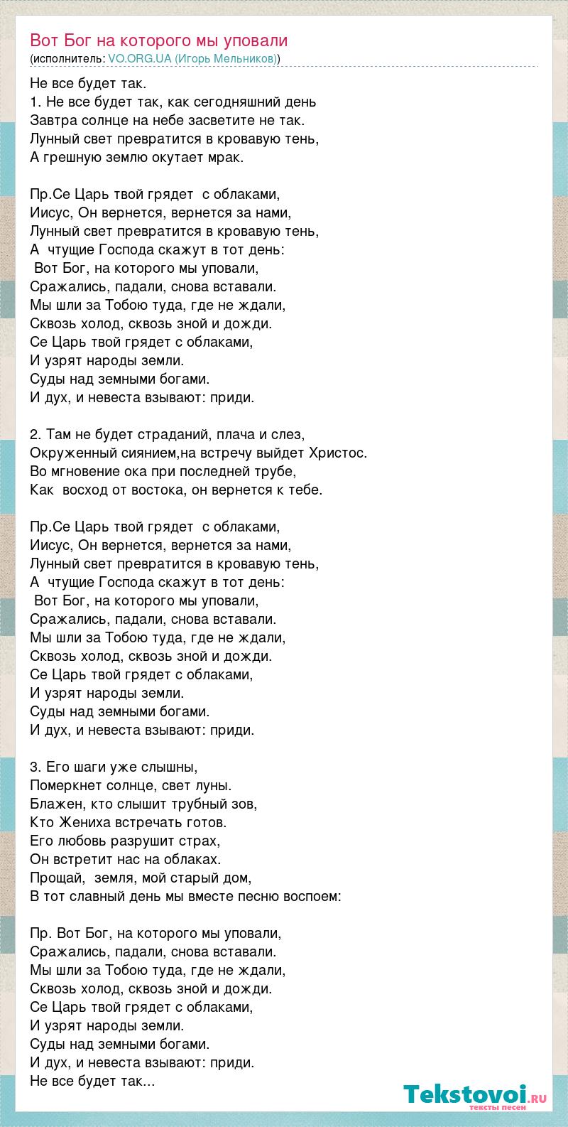 Не все будет так. 1. Не все будет так, как сегодняшний день Завтра солнце на небе засветите не так. Лунный свет превратится в кровавую тень, А грешную землю окутает мрак. Пр.Се Царь твой грядет с облаками, Иисус, Он вернется, вернется за нами, Лунный свет превратится в кровавую тень, А чтущие Господа скажут в тот день: Вот Бог, на которого мы уповали, Сражались, падали, снова вставали. Мы шли за Тобою туда, где не ждали, Сквозь холод, сквозь зной и дожди. Се Царь твой грядет с облаками, И узрят народы земли. Суды над земными богами. И дух, и невеста взывают: приди. 2. Там не будет страданий, плача и слез, Окруженный сиянием,на встречу выйдет Христос. Во мгновение ока при последней трубе, Как восход от востока, он вернется к тебе. Пр.Се Царь твой грядет с облаками, Иисус, Он вернется, вернется за нами, Лунный свет превратится в кровавую тень, А чтущие Господа скажут в тот день: Вот Бог, на которого мы уповали, Сражались, падали, снова вставали. Мы шли за Тобою туда, где не ждали, Сквозь холод, сквозь зной и дожди. Се Царь твой грядет с облаками, И узрят народы земли. Суды над земными богами. И дух, и невеста взывают: приди. 3. Его шаги уже слышны, Померкнет солнце, свет луны. Блажен, кто слышит трубный зов, Кто Жениха встречать готов. Его любовь разрушит страх, Он встретит нас на облаках. Прощай, земля, мой старый дом, В тот славный день мы вместе песню воспоем: Пр. Вот Бог, на которого мы уповали, Сражались, падали, снова вставали. Мы шли за Тобою туда, где не ждали, Сквозь холод, сквозь зной и дожди. Се Царь твой грядет с облаками, И узрят народы земли. Суды над земными богами. И дух, и невеста взывают: приди. Не все будет так...