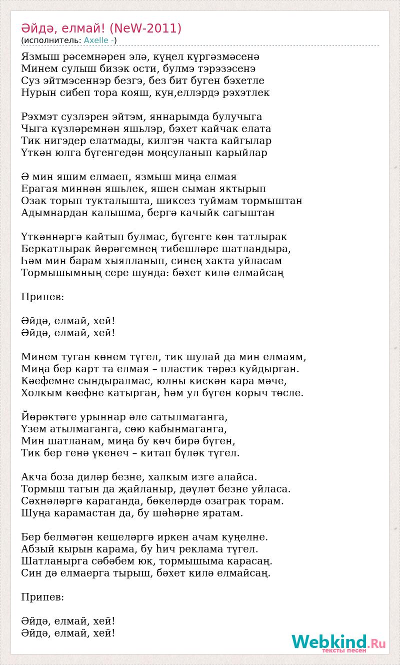 Язмыш рәсемнәрен элә, күңел күргәзмәсенә Минем сулыш бизэк ости, булмэ тэрэзэсенэ Суз эйтмэсеннэр безгэ, без бит буген бэхетле Нурын сибеп тора кояш, кун,еллэрдэ рэхэтлек Рэхмэт сузлэрен эйтэм, яннарымда булучыга Чыга күзләремнән яшьлэр, бэхет кайчак елата Тик нигэдер елатмады, килгэн чакта кайгылар Үткән юлга бүгенгедән моңсуланып карыйлар Ә мин яшим елмаеп, язмыш миңа елмая Ерагая миннән яшьлек, яшен сыман яктырып Озак торып тукталышта, шиксез туймам тормыштан Адымнардан калышма, бергә качыйк сагыштан Үткәннәргә кайтып булмас, бүгенге көн татлырак Беркатлырак йөрәгемнең тибешләре шатландыра, Һәм мин барам хыялланып, синең хакта уйласам Тормышымның сере шунда: бәхет килә елмайсаң Припев: Әйдә, елмай, хей! Әйдә, елмай, хей! Минем туган көнем түгел, тик шулай да мин елмаям, Миңа бер карт та елмая – пластик тәрәз куйдырган. Кәефемне сындыралмас, юлны кискән кара мәче, Холкым кәефне катырган, һәм ул бүген корыч төсле. Йөрәктәге урыннар әле сатылмаганга, Үзем атылмаганга, сөю кабынмаганга, Мин шатланам, миңа бу көч бирә бүген, Тик бер генә үкенеч – китап бүләк түгел. Акча боза диләр безне, халкым изге алайса. Тормыш тагын да җайланыр, дәүләт безне уйласа. Сәхнәләргә караганда, бөкеләрдә озаграк торам. Шуңа карамастан да, бу шәһәрне яратам. Бер белмәгән кешеләргә иркен ачам куңелне. Абзый кырын карама, бу һич реклама түгел. Шатланырга сәбәбем юк, тормышыма карасаң. Син дә елмаерга тырыш, бәхет килә елмайсаң. Припев: Әйдә, елмай, хей! Әйдә, елмай, хей!
