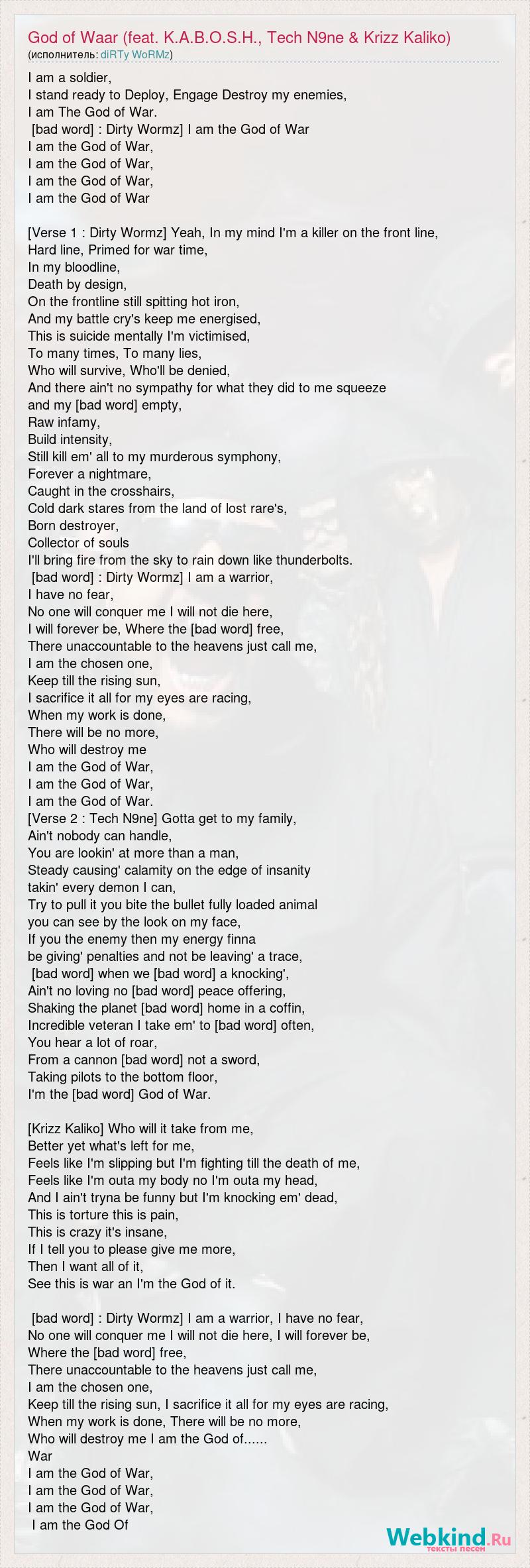 I am a soldier, I stand ready to Deploy, Engage Destroy my enemies, I am The God of War. [bad word] : Dirty Wormz] I am the God of War I am the God of War, I am the God of War, I am the God of War, I am the God of War [Verse 1 : Dirty Wormz] Yeah, In my mind I'm a killer on the front line, Hard line, Primed for war time, In my bloodline, Death by design, On the frontline still spitting hot iron, And my battle cry's keep me energised, This is suicide mentally I'm victimised, To many times, To many lies, Who will survive, Who'll be denied, And there ain't no sympathy for what they did to me squeeze and my [bad word] empty, Raw infamy, Build intensity, Still kill em' all to my murderous symphony, Forever a nightmare, Caught in the crosshairs, Cold dark stares from the land of lost rare's, Born destroyer, Collector of souls I'll bring fire from the sky to rain down like thunderbolts. [bad word] : Dirty Wormz] I am a warrior, I have no fear, No one will conquer me I will not die here, I will forever be, Where the [bad word] free, There unaccountable to the heavens just call me, I am the chosen one, Keep till the rising sun, I sacrifice it all for my eyes are racing, When my work is done, There will be no more, Who will destroy me I am the God of War, I am the God of War, I am the God of War. [Verse 2 : Tech N9ne] Gotta get to my family, Ain't nobody can handle, You are lookin' at more than a man, Steady causing' calamity on the edge of insanity takin' every demon I can, Try to pull it you bite the bullet fully loaded animal you can see by the look on my face, If you the enemy then my energy finna be giving' penalties and not be leaving' a trace, [bad word] when we [bad word] a knocking', Ain't no loving no [bad word] peace offering, Shaking the planet [bad word] home in a coffin, Incredible veteran I take em' to [bad word] often, You hear a lot of roar, From a cannon [bad word] not a sword, Taking pilots to the bottom floor, I'm the [bad word] God of War. [Krizz Kaliko] Who will it take from me, Better yet what's left for me, Feels like I'm slipping but I'm fighting till the death of me, Feels like I'm outa my body no I'm outa my head, And I ain't tryna be funny but I'm knocking em' dead, This is torture this is pain, This is crazy it's insane, If I tell you to please give me more, Then I want all of it, See this is war an I'm the God of it. [bad word] : Dirty Wormz] I am a warrior, I have no fear, No one will conquer me I will not die here, I will forever be, Where the [bad word] free, There unaccountable to the heavens just call me, I am the chosen one, Keep till the rising sun, I sacrifice it all for my eyes are racing, When my work is done, There will be no more, Who will destroy me I am the God of...... War I am the God of War, I am the God of War, I am the God of War, I am the God Of