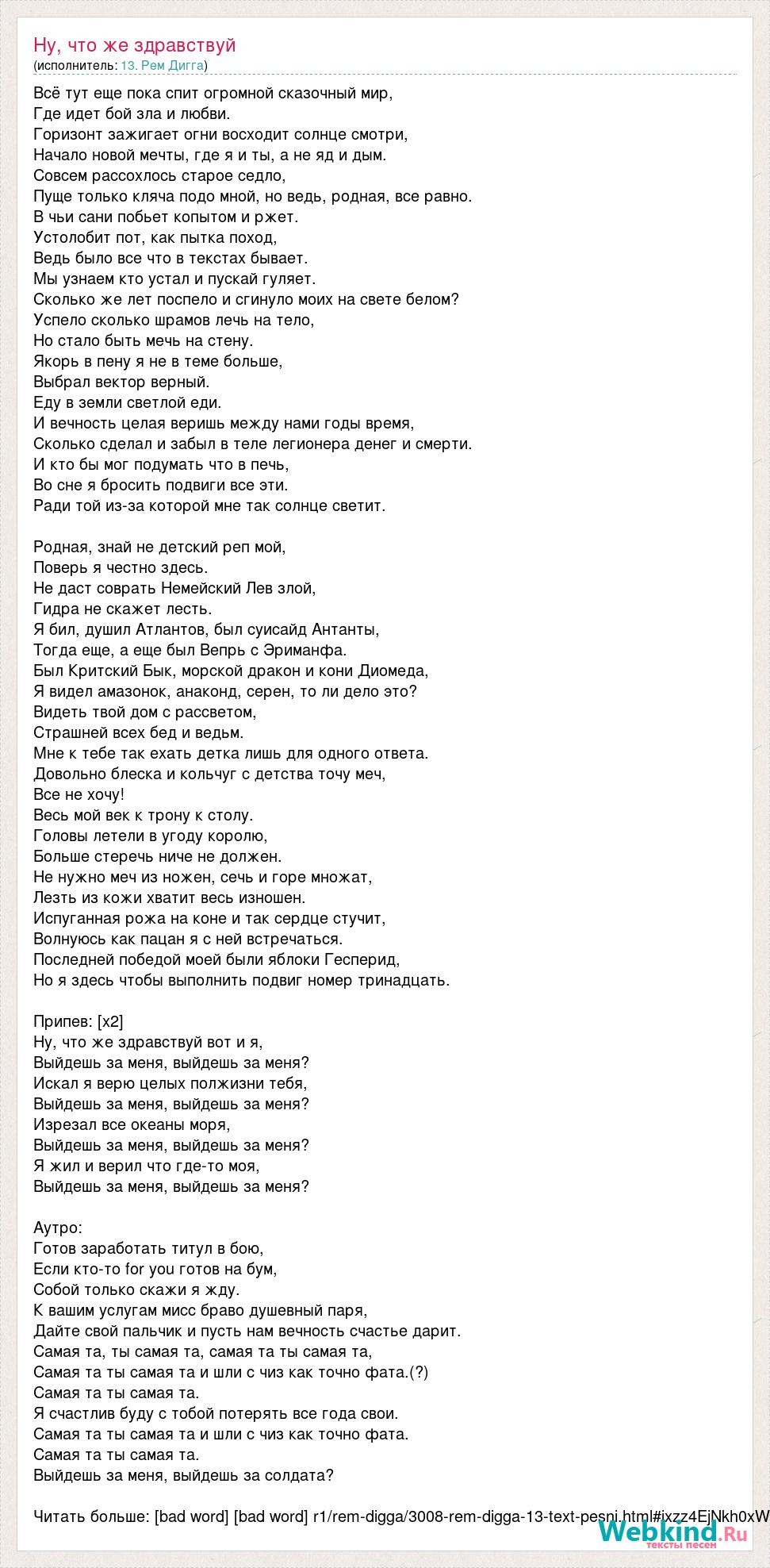 Всё тут еще пока спит огромной сказочный мир, Где идет бой зла и любви. Горизонт зажигает огни восходит солнце смотри, Начало новой мечты, где я и ты, а не яд и дым. Совсем рассохлось старое седло, Пуще только кляча подо мной, но ведь, родная, все равно. В чьи сани побьет копытом и ржет. Устолобит пот, как пытка поход, Ведь было все что в текстах бывает. Мы узнаем кто устал и пускай гуляет. Сколько же лет поспело и сгинуло моих на свете белом? Успело сколько шрамов лечь на тело, Но стало быть мечь на стену. Якорь в пену я не в теме больше, Выбрал вектор верный. Еду в земли светлой еди. И вечность целая веришь между нами годы время, Сколько сделал и забыл в теле легионера денег и смерти. И кто бы мог подумать что в печь, Во сне я бросить подвиги все эти. Ради той из-за которой мне так солнце светит. Родная, знай не детский реп мой, Поверь я честно здесь. Не даст соврать Немейский Лев злой, Гидра не скажет лесть. Я бил, душил Атлантов, был суисайд Антанты, Тогда еще, а еще был Вепрь с Эриманфа. Был Критский Бык, морской дракон и кони Диомеда, Я видел амазонок, анаконд, серен, то ли дело это? Видеть твой дом с рассветом, Страшней всех бед и ведьм. Мне к тебе так ехать детка лишь для одного ответа. Довольно блеска и кольчуг с детства точу меч, Все не хочу! Весь мой век к трону к столу. Головы летели в угоду королю, Больше стеречь ниче не должен. Не нужно меч из ножен, сечь и горе множат, Лезть из кожи хватит весь изношен. Испуганная рожа на коне и так сердце стучит, Волнуюсь как пацан я с ней встречаться. Последней победой моей были яблоки Гесперид, Но я здесь чтобы выполнить подвиг номер тринадцать. Припев: [х2] Ну, что же здравствуй вот и я, Выйдешь за меня, выйдешь за меня? Искал я верю целых полжизни тебя, Выйдешь за меня, выйдешь за меня? Изрезал все океаны моря, Выйдешь за меня, выйдешь за меня? Я жил и верил что где-то моя, Выйдешь за меня, выйдешь за меня? Аутро: Готов заработать титул в бою, Если кто-то for you готов на бум, Собой только скажи я жду. К вашим услугам мисс браво душевный паря, Дайте свой пальчик и пусть нам вечность счастье дарит. Самая та, ты самая та, самая та ты самая та, Самая та ты самая та и шли с чиз как точно фата.(?) Самая та ты самая та. Я счастлив буду с тобой потерять все года свои. Самая та ты самая та и шли с чиз как точно фата. Самая та ты самая та. Выйдешь за меня, выйдешь за солдата? Читать больше: [bad word] [bad word] r1/rem-digga/3008-rem-digga-13-text-pesni.html#ixzz4EjNkh0xW