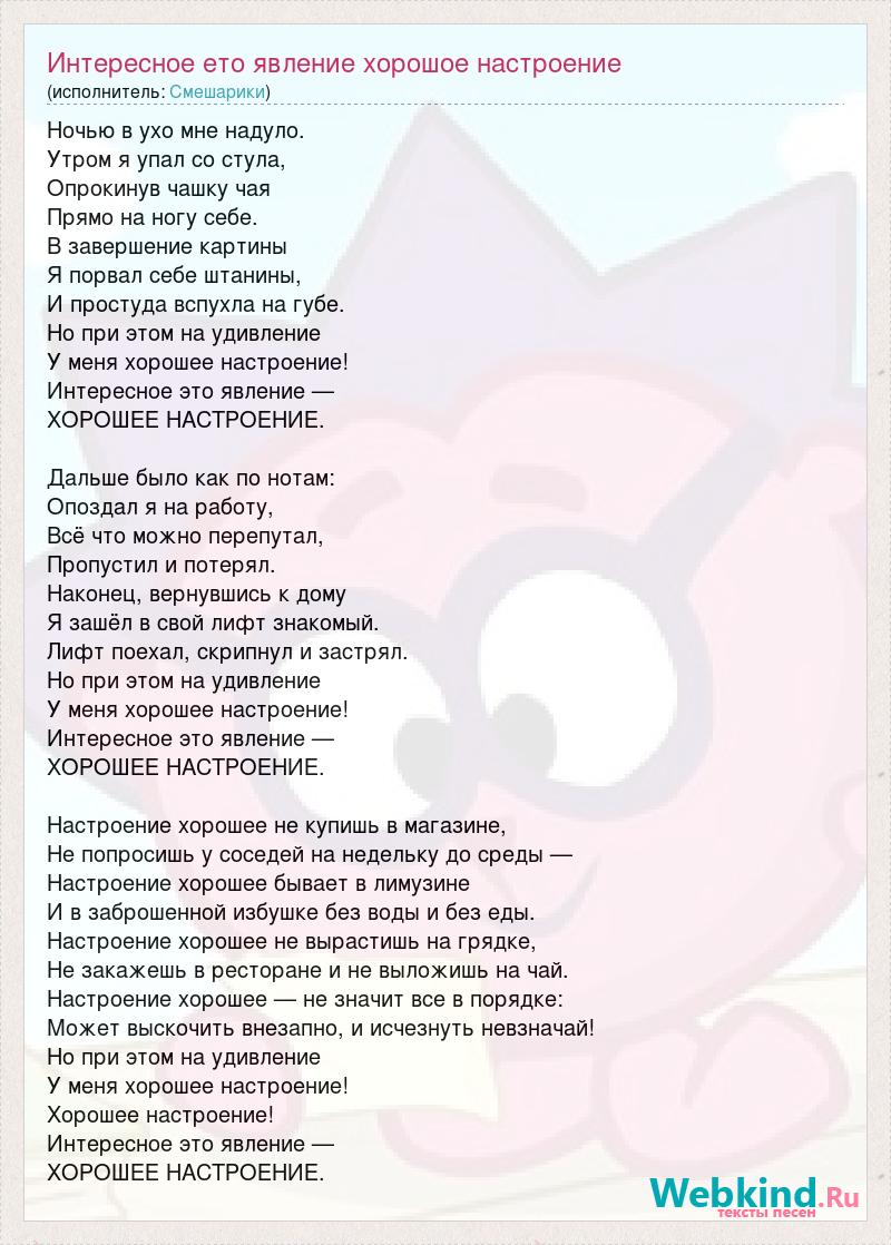 Ночью в ухо мне надуло. Утром я упал со стула, Опрокинув чашку чая Прямо на ногу себе. В завершение картины Я порвал себе штанины, И простуда вспухла на губе. Но при этом на удивление У меня хорошее настроение! Интересное это явление — ХОРОШЕЕ НАСТРОЕНИЕ. Дальше было как по нотам: Опоздал я на работу, Всё что можно перепутал, Пропустил и потерял. Наконец, вернувшись к дому Я зашёл в свой лифт знакомый. Лифт поехал, скрипнул и застрял. Но при этом на удивление У меня хорошее настроение! Интересное это явление — ХОРОШЕЕ НАСТРОЕНИЕ. Настроение хорошее не купишь в магазине, Не попросишь у соседей на недельку до среды — Настроение хорошее бывает в лимузине И в заброшенной избушке без воды и без еды. Настроение хорошее не вырастишь на грядке, Не закажешь в ресторане и не выложишь на чай. Настроение хорошее — не значит все в порядке: Может выскочить внезапно, и исчезнуть невзначай! Но при этом на удивление У меня хорошее настроение! Хорошее настроение! Интересное это явление — ХОРОШЕЕ НАСТРОЕНИЕ.