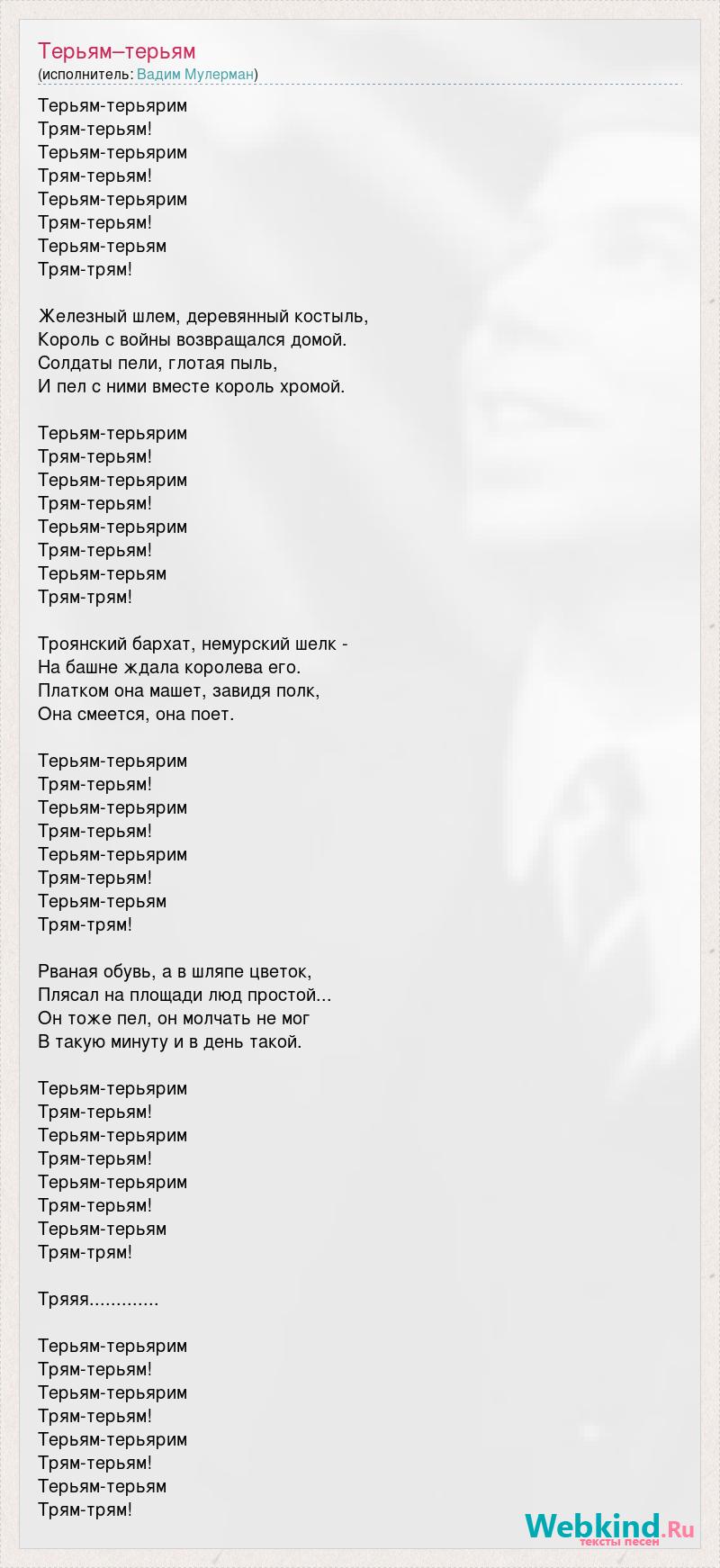 Терьям-терьярим Трям-терьям! Терьям-терьярим Трям-терьям! Терьям-терьярим Трям-терьям! Терьям-терьям Трям-трям! Железный шлем, деревянный костыль, Король с войны возвращался домой. Солдаты пели, глотая пыль, И пел с ними вместе король хромой. Терьям-терьярим Трям-терьям! Терьям-терьярим Трям-терьям! Терьям-терьярим Трям-терьям! Терьям-терьям Трям-трям! Троянский бархат, немурский шелк - На башне ждала королева его. Платком она машет, завидя полк, Она смеется, она поет. Терьям-терьярим Трям-терьям! Терьям-терьярим Трям-терьям! Терьям-терьярим Трям-терьям! Терьям-терьям Трям-трям! Рваная обувь, а в шляпе цветок, Плясал на площади люд простой... Он тоже пел, он молчать не мог В такую минуту и в день такой. Терьям-терьярим Трям-терьям! Терьям-терьярим Трям-терьям! Терьям-терьярим Трям-терьям! Терьям-терьям Трям-трям! Тряяя............. Терьям-терьярим Трям-терьям! Терьям-терьярим Трям-терьям! Терьям-терьярим Трям-терьям! Терьям-терьям Трям-трям!