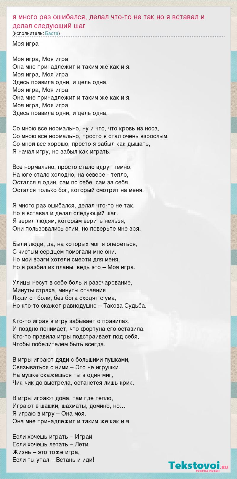 Моя игра Моя игра, Моя игра Она мне принадлежит и таким же как и я. Моя игра, Моя игра Здесь правила одни, и цель одна. Моя игра, Моя игра Она мне принадлежит и таким же как и я. Моя игра, Моя игра Здесь правила одни, и цель одна. Со мною все нормально, ну и что, что кровь из носа, Со мною все нормально, просто я стал очень взрослым, Со мной все хорошо, просто я забыл как дышать, Я начал игру, но забыл как играть. Все нормально, просто стало вдруг темно, На юге стало холодно, на севере - тепло, Остался я один, сам по себе, сам за себя. Остался только бог, который смотрит на меня. Я много раз ошибался, делал что-то не так, Но я вставал и делал следующий шаг. Я верил людям, которым верить нельзя, Они пользовались этим, но поверьте мне зря. Были люди, да, на которых мог я опереться, С чистым сердцем помогали мне они. Но мои враги хотели смерти для меня, Но я разбил их планы, ведь это – Моя игра. Улицы несут в себе боль и разочарование, Минуты страха, минуты отчаяния Люди от боли, без бога сходят с ума, Но кто-то скажет равнодушно – Такова Судьба. Кто-то играя в игру забывает о правилах. И поздно понимает, что фортуна его оставила. Кто-то правила игры подстраивает под себя, Чтобы победителем быть всегда. В игры играют дяди с большими пушками, Связываться с ними – Это не игрушки. На мушке окажешься ты в один миг, Чик-чик до выстрела, останется лишь крик. В игры играют дома, там где тепло, Играют в шашки, шахматы, домино, но… Я играю в игру – Она моя. Она мне принадлежит и таким же как и я. Если хочешь играть – Играй Если хочешь летать – Лети Жизнь – это тоже игра, Если ты упал – Встань и иди!