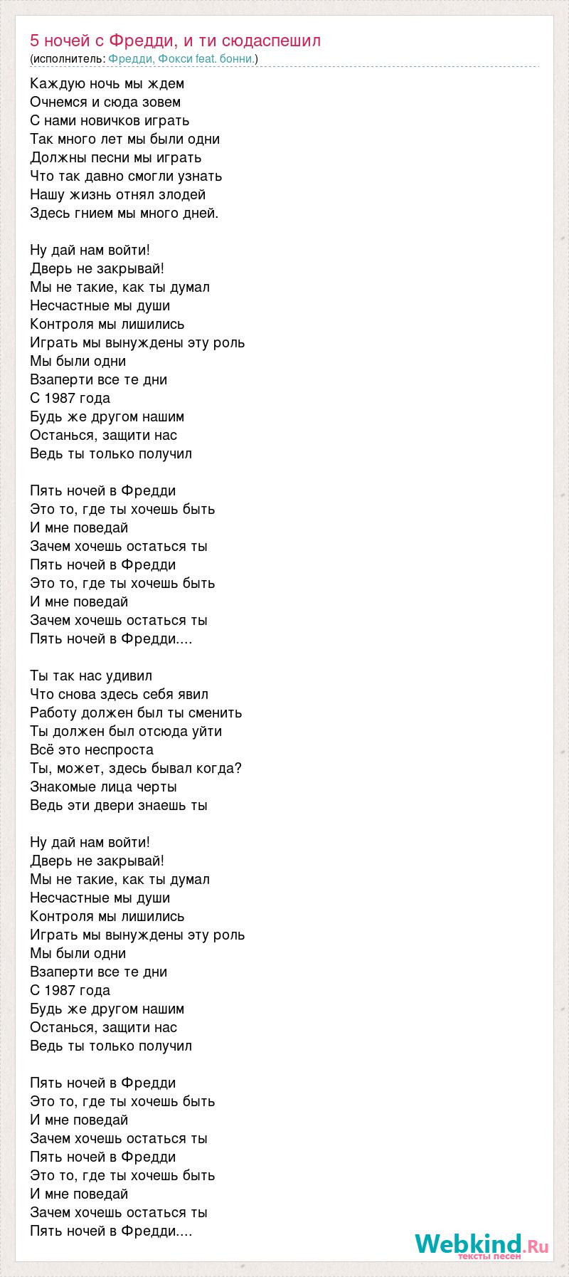 Каждую ночь мы ждем Очнемся и сюда зовем С нами новичков играть Так много лет мы были одни Должны песни мы играть Что так давно смогли узнать Нашу жизнь отнял злодей Здесь гнием мы много дней. Ну дай нам войти! Дверь не закрывай! Мы не такие, как ты думал Несчастные мы души Контроля мы лишились Играть мы вынуждены эту роль Мы были одни Взаперти все те дни С 1987 года Будь же другом нашим Останься, защити нас Ведь ты только получил Пять ночей в Фредди Это то, где ты хочешь быть И мне поведай Зачем хочешь остаться ты Пять ночей в Фредди Это то, где ты хочешь быть И мне поведай Зачем хочешь остаться ты Пять ночей в Фредди.... Ты так нас удивил Что снова здесь себя явил Работу должен был ты сменить Ты должен был отсюда уйти Всё это неспроста Ты, может, здесь бывал когда? Знакомые лица черты Ведь эти двери знаешь ты Ну дай нам войти! Дверь не закрывай! Мы не такие, как ты думал Несчастные мы души Контроля мы лишились Играть мы вынуждены эту роль Мы были одни Взаперти все те дни С 1987 года Будь же другом нашим Останься, защити нас Ведь ты только получил Пять ночей в Фредди Это то, где ты хочешь быть И мне поведай Зачем хочешь остаться ты Пять ночей в Фредди Это то, где ты хочешь быть И мне поведай Зачем хочешь остаться ты Пять ночей в Фредди....