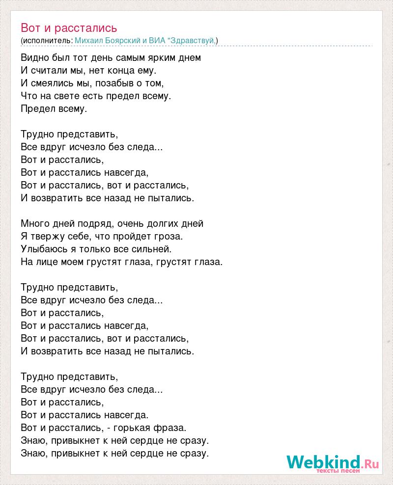 Видно был тот день самым ярким днем И считали мы, нет конца ему. И смеялись мы, позабыв о том, Что на свете есть предел всему. Предел всему. Трудно представить, Все вдруг исчезло без следа... Вот и расстались, Вот и расстались навсегда, Вот и расстались, вот и расстались, И возвратить все назад не пытались. Много дней подряд, очень долгих дней Я твержу себе, что пройдет гроза. Улыбаюсь я только все сильней. На лице моем грустят глаза, грустят глаза. Трудно представить, Все вдруг исчезло без следа... Вот и расстались, Вот и расстались навсегда, Вот и расстались, вот и расстались, И возвратить все назад не пытались. Трудно представить, Все вдруг исчезло без следа... Вот и расстались, Вот и расстались навсегда. Вот и расстались, - горькая фраза. Знаю, привыкнет к ней сердце не сразу. Знаю, привыкнет к ней сердце не сразу.