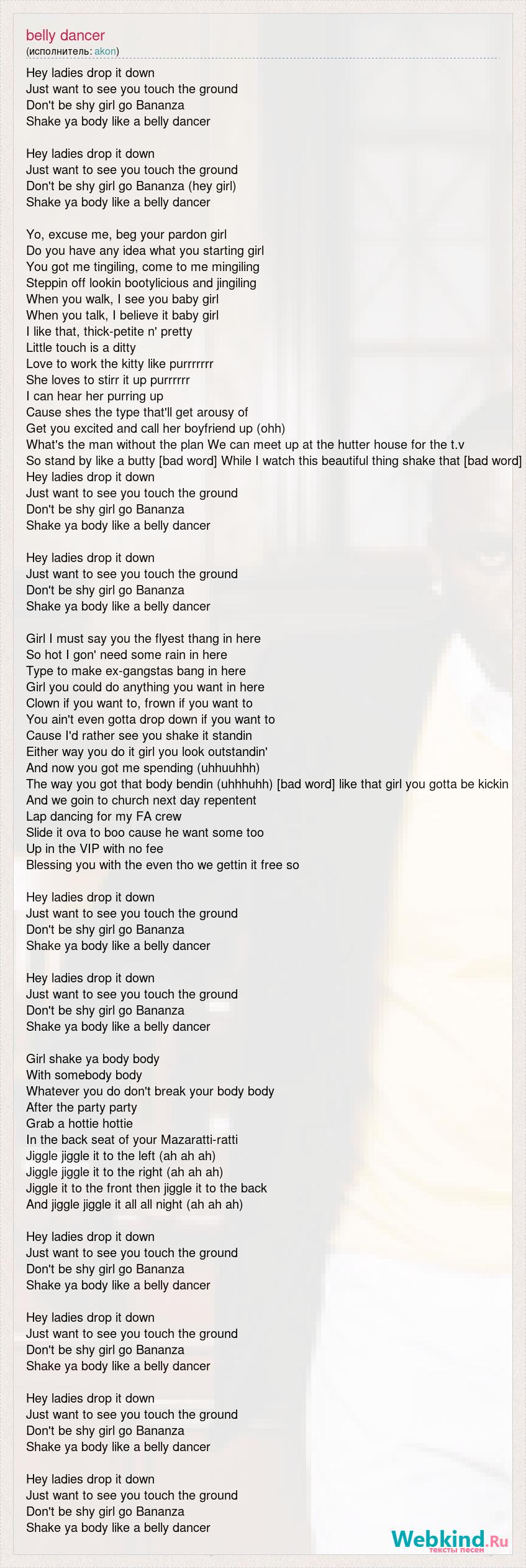 Hey ladies drop it down Just want to see you touch the ground Don't be shy girl go Bananza Shake ya body like a belly dancer Hey ladies drop it down Just want to see you touch the ground Don't be shy girl go Bananza (hey girl) Shake ya body like a belly dancer Yo, excuse me, beg your pardon girl Do you have any idea what you starting girl You got me tingiling, come to me mingiling Steppin off lookin bootylicious and jingiling When you walk, I see you baby girl When you talk, I believe it baby girl I like that, thick-petite n' pretty Little touch is a ditty Love to work the kitty like purrrrrrr She loves to stirr it up purrrrrr I can hear her purring up Cause shes the type that'll get arousy of Get you excited and call her boyfriend up (ohh) What's the man without the plan We can meet up at the hutter house for the t.v So stand by like a butty [bad word] While I watch this beautiful thing shake that [bad word] Hey ladies drop it down Just want to see you touch the ground Don't be shy girl go Bananza Shake ya body like a belly dancer Hey ladies drop it down Just want to see you touch the ground Don't be shy girl go Bananza Shake ya body like a belly dancer Girl I must say you the flyest thang in here So hot I gon' need some rain in here Type to make ex-gangstas bang in here Girl you could do anything you want in here Clown if you want to, frown if you want to You ain't even gotta drop down if you want to Cause I'd rather see you shake it standin Either way you do it girl you look outstandin' And now you got me spending (uhhuuhhh) The way you got that body bendin (uhhhuhh) [bad word] like that girl you gotta be kickin And we goin to church next day repentent Lap dancing for my FA crew Slide it ova to boo cause he want some too Up in the VIP with no fee Blessing you with the even tho we gettin it free so Hey ladies drop it down Just want to see you touch the ground Don't be shy girl go Bananza Shake ya body like a belly dancer Hey ladies drop it down Just want to see you touch the ground Don't be shy girl go Bananza Shake ya body like a belly dancer Girl shake ya body body With somebody body Whatever you do don't break your body body After the party party Grab a hottie hottie In the back seat of your Mazaratti-ratti Jiggle jiggle it to the left (ah ah ah) Jiggle jiggle it to the right (ah ah ah) Jiggle it to the front then jiggle it to the back And jiggle jiggle it all all night (ah ah ah) Hey ladies drop it down Just want to see you touch the ground Don't be shy girl go Bananza Shake ya body like a belly dancer Hey ladies drop it down Just want to see you touch the ground Don't be shy girl go Bananza Shake ya body like a belly dancer Hey ladies drop it down Just want to see you touch the ground Don't be shy girl go Bananza Shake ya body like a belly dancer Hey ladies drop it down Just want to see you touch the ground Don't be shy girl go Bananza Shake ya body like a belly dancer