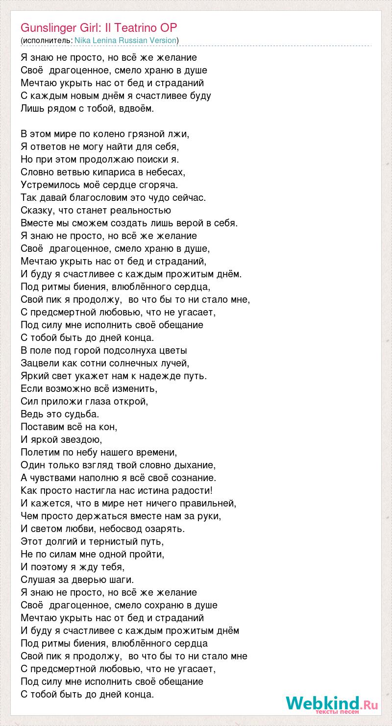 Я знаю не просто, но всё же желание Своё драгоценное, смело храню в душе Мечтаю укрыть нас от бед и страданий С каждым новым днём я счастливее буду Лишь рядом с тобой, вдвоём. В этом мире по колено грязной лжи, Я ответов не могу найти для себя, Но при этом продолжаю поиски я. Словно ветвью кипариса в небесах, Устремилось моё сердце сгоряча. Так давай благословим это чудо сейчас. Сказку, что станет реальностью Вместе мы сможем создать лишь верой в себя. Я знаю не просто, но всё же желание Своё драгоценное, смело храню в душе, Мечтаю укрыть нас от бед и страданий, И буду я счастливее с каждым прожитым днём. Под ритмы биения, влюблённого сердца, Свой пик я продолжу, во что бы то ни стало мне, С предсмертной любовью, что не угасает, Под силу мне исполнить своё обещание С тобой быть до дней конца. В поле под горой подсолнуха цветы Зацвели как сотни солнечных лучей, Яркий свет укажет нам к надежде путь. Если возможно всё изменить, Сил приложи глаза открой, Ведь это судьба. Поставим всё на кон, И яркой звездою, Полетим по небу нашего времени, Один только взгляд твой словно дыхание, А чувствами наполню я всё своё сознание. Как просто настигла нас истина радости! И кажется, что в мире нет ничего правильней, Чем просто держаться вместе нам за руки, И светом любви, небосвод озарять. Этот долгий и тернистый путь, Не по силам мне одной пройти, И поэтому я жду тебя, Слушая за дверью шаги. Я знаю не просто, но всё же желание Своё драгоценное, смело сохраню в душе Мечтаю укрыть нас от бед и страданий И буду я счастливее с каждым прожитым днём Под ритмы биения, влюблённого сердца Свой пик я продолжу, во что бы то ни стало мне С предсмертной любовью, что не угасает, Под силу мне исполнить своё обещание С тобой быть до дней конца.