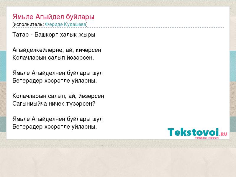 Татар - Башкорт халык җыры Агыйделкәйләрне, ай, кичәрсең Колачларың салып йөзәрсең. Ямьле Агыйделнең буйлары шул Бетерәдер хәсрәтле уйларны. Колачларың салып, ай, йөзәрсең Сагынмыйча ничек түзәрсең? Ямьле Агыйделнең буйлары шул Бетерәдер хәсрәтле уйларны.