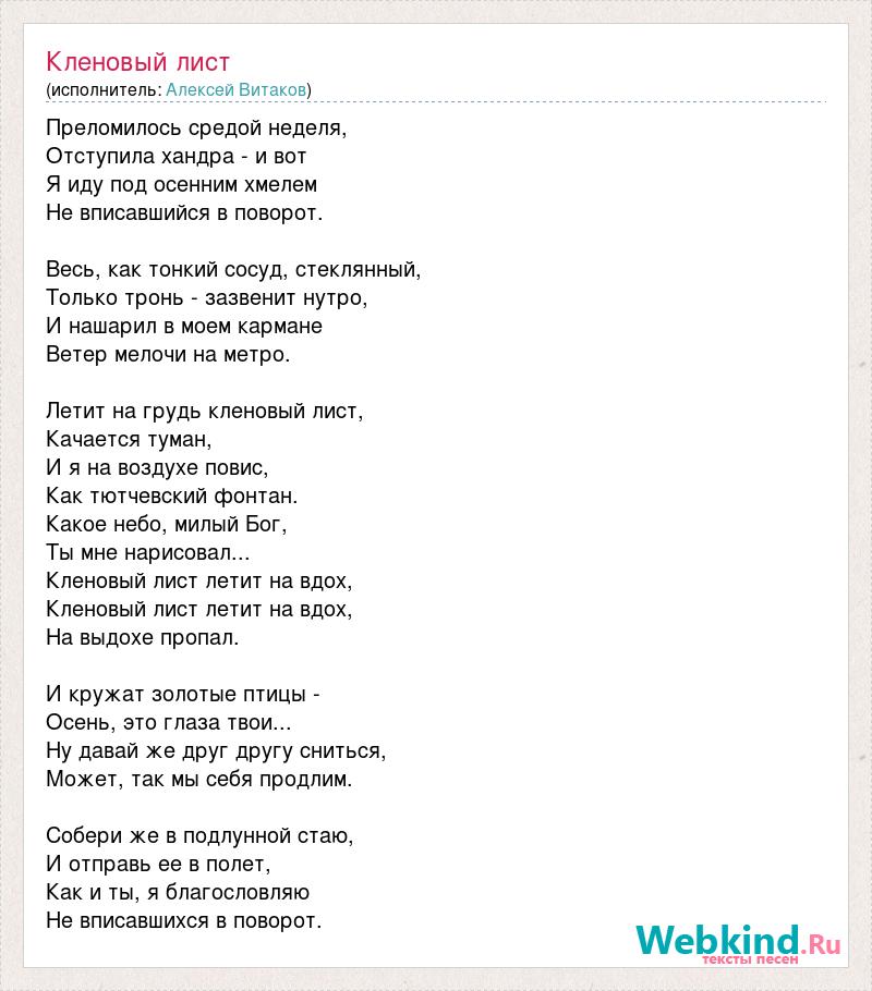 Преломилось средой неделя, Отступила хандра - и вот Я иду под осенним хмелем Не вписавшийся в поворот. Весь, как тонкий сосуд, стеклянный, Только тронь - зазвенит нутро, И нашарил в моем кармане Ветер мелочи на метро. Летит на грудь кленовый лист, Качается туман, И я на воздухе повис, Как тютчевский фонтан. Какое небо, милый Бог, Ты мне нарисовал... Кленовый лист летит на вдох, Кленовый лист летит на вдох, На выдохе пропал. И кружат золотые птицы - Осень, это глаза твои... Ну давай же друг другу сниться, Может, так мы себя продлим. Собери же в подлунной стаю, И отправь ее в полет, Как и ты, я благословляю Не вписавшихся в поворот.