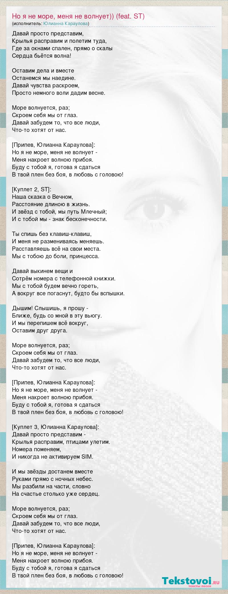 Давай просто представим, Крылья расправим и полетим туда, Где за окнами спален, прямо о скалы Сердца бьётся волна! Оставим дела и вместе Останемся мы наедине. Давай чувства раскроем, Просто немного воли дадим весне. Море волнуется, раз; Скроем себя мы от глаз. Давай забудем то, что все люди, Что-то хотят от нас. [Припев, Юлианна Караулова]: Но я не море, меня не волнует - Меня накроет волною прибоя. Буду с тобой я, готова я сдаться В твой плен без боя, в любовь с головою! [Куплет 2, ST]: Наша сказка о Вечном, Расстояние длиною в жизнь. И звёзд с тобой, мы путь Млечный; И с тобой мы - знак бесконечности. Ты спишь без клавиш-клавиш, И меня не размениваясь меняешь. Расставляешь всё на свои места. Мы с тобою до боли, принцесса. Давай выкинем вещи и Сотрём номера с телефонной книжки. Мы с тобой будем вечно гореть, А вокруг все погаснут, будто бы вспышки. Дышим! Слышишь, я прошу - Ближе, будь со мной в эту вьюгу. И мы перепишем всё вокруг, Оставим друг друга. Море волнуется, раз; Скроем себя мы от глаз. Давай забудем то, что все люди, Что-то хотят от нас. [Припев, Юлианна Караулова]: Но я не море, меня не волнует - Меня накроет волною прибоя. Буду с тобой я, готова я сдаться В твой плен без боя, в любовь с головою! [Куплет 3, Юлианна Караулова]: Давай просто представим - Крылья расправим, птицами улетим. Номера поменяем, И никогда не активируем SIM. И мы звёзды достанем вместе Руками прямо с ночных небес. Мы разбили на части, словно На счастье столько уже сердец. Море волнуется, раз; Скроем себя мы от глаз. Давай забудем то, что все люди, Что-то хотят от нас. [Припев, Юлианна Караулова]: Но я не море, меня не волнует - Меня накроет волною прибоя. Буду с тобой я, готова я сдаться В твой плен без боя, в любовь с головою!