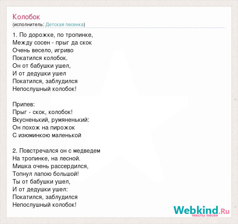 1. По дорожке, по тропинке, Между сосен - прыг да скок Очень весело, игриво Покатился колобок. Он от бабушки ушел, И от дедушки ушел Покатился, заблудился Непослушный колобок! Припев: Прыг - скок, колобок! Вкусненький, румяненький: Он похож на пирожок С изюминкою маленькой 2. Повстречался он с медведем На тропинке, на лесной. Мишка очень рассердился, Топнул лапою большой! Ты от бабушки ушел, И от дедушки ушел: Покатился, заблудился Непослушный колобок!