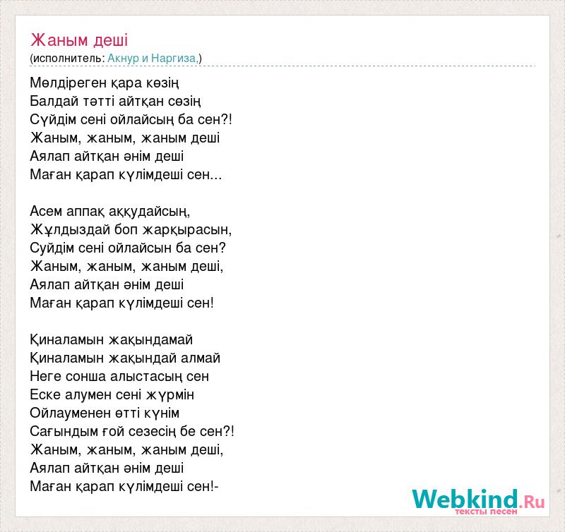 Мөлдіреген қара көзің Балдай тәтті айтқан сөзің Сүйдім сені ойлайсың ба сен?! Жаным, жаным, жаным деші Аялап айтқан әнім деші Маған қарап күлімдеші сен... Асем аппақ аққудайсың, Жұлдыздай боп жарқырасын, Суйдiм сенi ойлайсын ба сен? Жаным, жаным, жаным деші, Аялап айтқан әнім деші Маған қарап күлімдеші сен! Қиналамын жақындамай Қиналамын жақындай алмай Неге сонша алыстасың сен Еске алумен сені жүрмін Ойлауменен өтті күнім Сағындым ғой сезесің бе сен?! Жаным, жаным, жаным деші, Аялап айтқан әнім деші Маған қарап күлімдеші сен!-