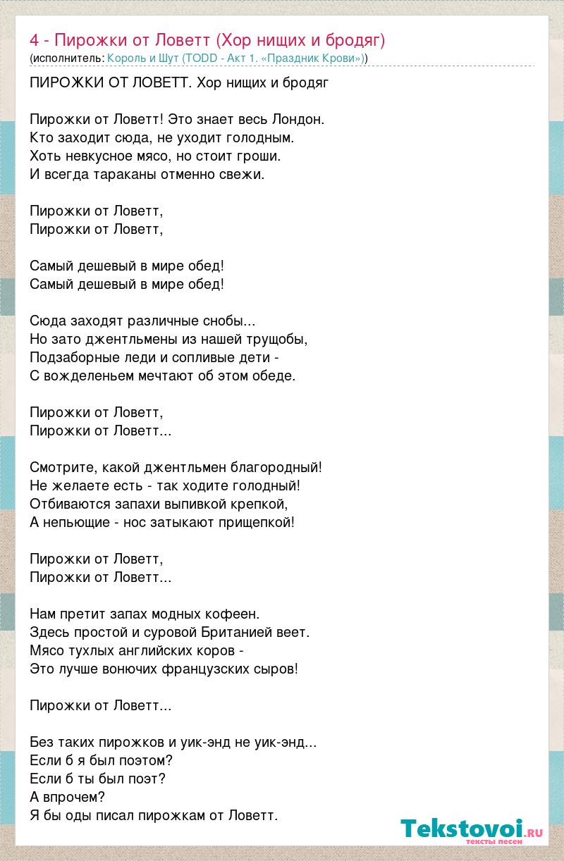 ПИРОЖКИ ОТ ЛОВЕТТ. Хор нищих и бродяг Пирожки от Ловетт! Это знает весь Лондон. Кто заходит сюда, не уходит голодным. Хоть невкусное мясо, но стоит гроши. И всегда тараканы отменно свежи. Пирожки от Ловетт, Пирожки от Ловетт, Самый дешевый в мире обед! Самый дешевый в мире обед! Сюда заходят различные снобы... Но зато джентльмены из нашей трущобы, Подзаборные леди и сопливые дети - С вожделеньем мечтают об этом обеде. Пирожки от Ловетт, Пирожки от Ловетт... Смотрите, какой джентльмен благородный! Не желаете есть - так ходите голодный! Отбиваются запахи выпивкой крепкой, А непьющие - нос затыкают прищепкой! Пирожки от Ловетт, Пирожки от Ловетт... Нам претит запах модных кофеен. Здесь простой и суровой Британией веет. Мясо тухлых английских коров - Это лучше вонючих французских сыров! Пирожки от Ловетт... Без таких пирожков и уик-энд не уик-энд... Если б я был поэтом? Если б ты был поэт? А впрочем? Я бы оды писал пирожкам от Ловетт.