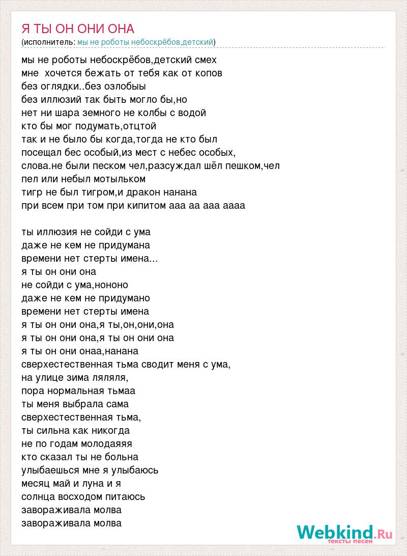 мы не роботы небоскрёбов,детский смех мне хочется бежать от тебя как от копов без оглядки..без озлобыы без иллюзий так быть могло бы,но нет ни шара земного не колбы с водой кто бы мог подумать,отцтой так и не было бы когда,тогда не кто был посещал бес особый,из мест с небес особых, слова.не были песком чел,разсуждал шёл пешком,чел пел или небыл мотыльком тигр не был тигром,и дракон нанана при всем при том при кипитом ааа аа ааа аааа ты иллюзия не сойди с ума даже не кем не придумана времени нет стерты имена... я ты он они она не сойди с ума,нононо даже не кем не придумано времени нет стерты имена я ты он они она,я ты,он,они,она я ты он они она,я ты он они она я ты он они онаа,нанана сверхестественная тьма сводит меня с ума, на улице зима ляляля, пора нормальная тьмаа ты меня выбрала сама сверхестественная тьма, ты сильна как никогда не по годам молодаяяя кто сказал ты не больна улыбаешься мне я улыбаюсь месяц май и луна и я солнца восходом питаюсь завораживала молва завораживала молва
