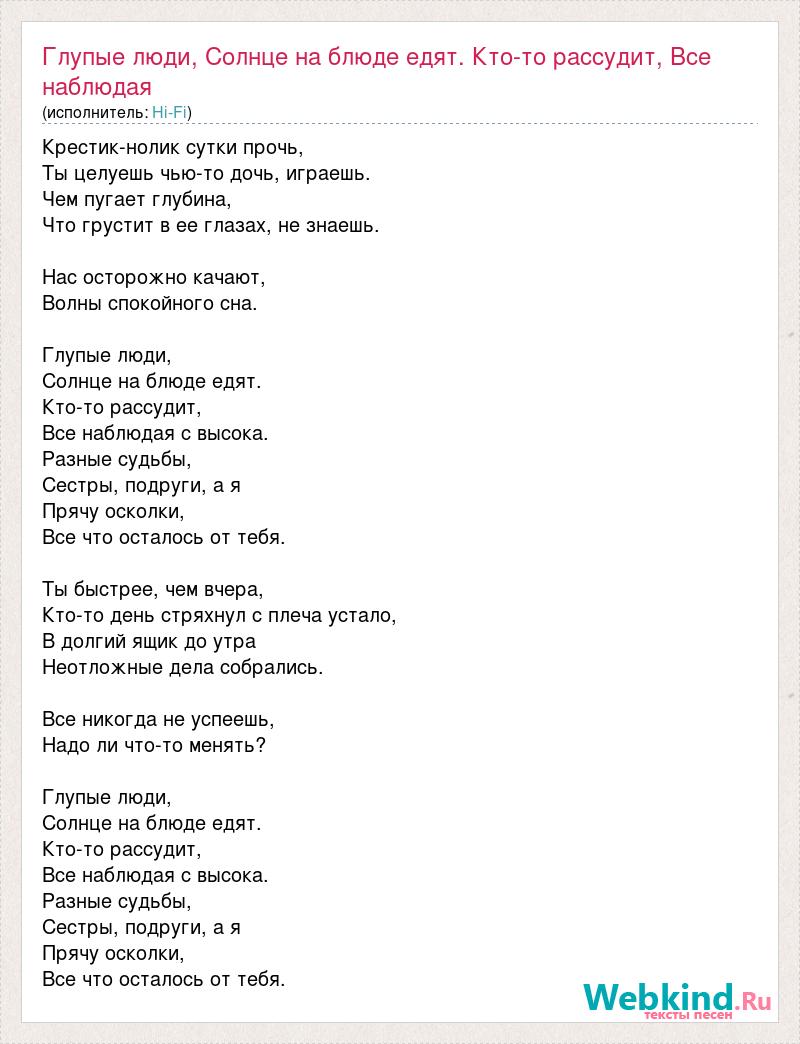 Крестик-нолик сутки прочь, Ты целуешь чью-то дочь, играешь. Чем пугает глубина, Что грустит в ее глазах, не знаешь. Нас осторожно качают, Волны спокойного сна. Глупые люди, Солнце на блюде едят. Кто-то рассудит, Все наблюдая с высока. Разные судьбы, Сестры, подруги, а я Прячу осколки, Все что осталось от тебя. Ты быстрее, чем вчера, Кто-то день стряхнул с плеча устало, В долгий ящик до утра Неотложные дела собрались. Все никогда не успеешь, Надо ли что-то менять? Глупые люди, Солнце на блюде едят. Кто-то рассудит, Все наблюдая с высока. Разные судьбы, Сестры, подруги, а я Прячу осколки, Все что осталось от тебя.