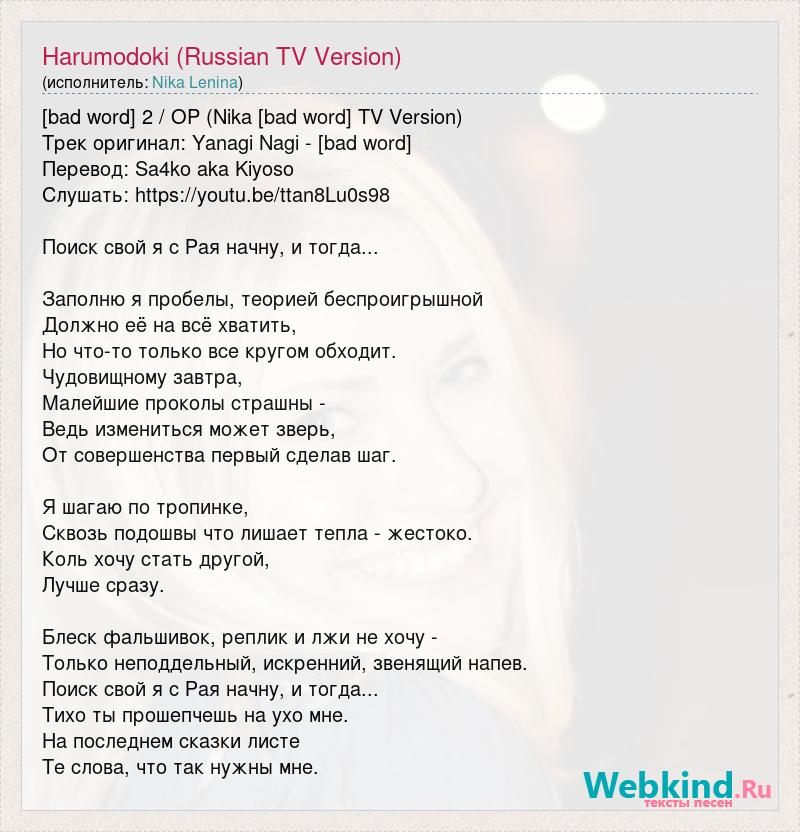[bad word] 2 / OP (Nika [bad word] TV Version) Трек оригинал: Yanagi Nagi - [bad word] Перевод: Sa4ko aka Kiyoso Слушать: https://youtu.be/ttan8Lu0s98 Поиск свой я с Рая начну, и тогда... Заполню я пробелы, теорией беспроигрышной Должно её на всё хватить, Но что-то только все кругом обходит. Чудовищному завтра, Малейшие проколы страшны - Ведь измениться может зверь, От совершенства первый сделав шаг. Я шагаю по тропинке, Сквозь подошвы что лишает тепла - жестоко. Коль хочу стать другой, Лучше сразу. Блеск фальшивок, реплик и лжи не хочу - Только неподдельный, искренний, звенящий напев. Поиск свой я с Рая начну, и тогда... Тихо ты прошепчешь на ухо мне. На последнем сказки листе Те слова, что так нужны мне.
