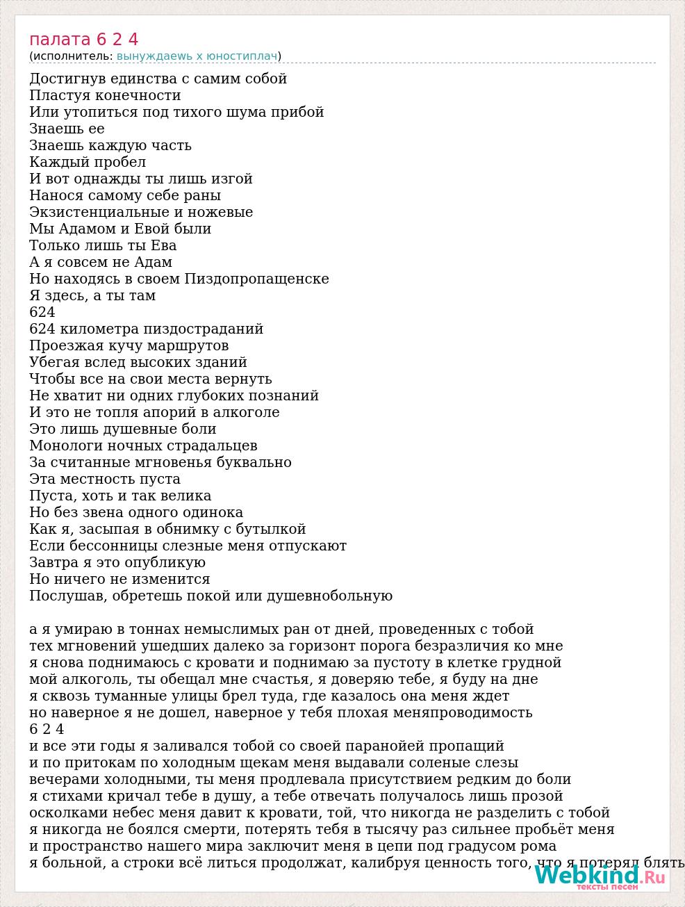 Достигнув единства с самим собой Пластуя конечности Или утопиться под тихого шума прибой Знаешь ее Знаешь каждую часть Каждый пробел И вот однажды ты лишь изгой Нанося самому себе раны Экзистенциальные и ножевые Мы Адамом и Евой были Только лишь ты Ева А я совсем не Адам Но находясь в своем Пиздопропащенске Я здесь, а ты там 624 624 километра пиздостраданий Проезжая кучу маршрутов Убегая вслед высоких зданий Чтобы все на свои места вернуть Не хватит ни одних глубоких познаний И это не топля апорий в алкоголе Это лишь душевные боли Монологи ночных страдальцев За считанные мгновенья буквально Эта местность пуста Пуста, хоть и так велика Но без звена одного одинока Как я, засыпая в обнимку с бутылкой Если бессонницы слезные меня отпускают Завтра я это опубликую Но ничего не изменится Послушав, обретешь покой или душевнобольную а я умираю в тоннах немыслимых ран от дней, проведенных с тобой тех мгновений ушедших далеко за горизонт порога безразличия ко мне я снова поднимаюсь с кровати и поднимаю за пустоту в клетке грудной мой алкоголь, ты обещал мне счастья, я доверяю тебе, я буду на дне я сквозь туманные улицы брел туда, где казалось она меня ждет но наверное я не дошел, наверное у тебя плохая меняпроводимость 6 2 4 и все эти годы я заливался тобой со своей паранойей пропащий и по притокам по холодным щекам меня выдавали соленые слезы вечерами холодными, ты меня продлевала присутствием редким до боли я стихами кричал тебе в душу, а тебе отвечать получалось лишь прозой осколками небес меня давит к кровати, той, что никогда не разделить с тобой я никогда не боялся смерти, потерять тебя в тысячу раз сильнее пробьёт меня и пространство нашего мира заключит меня в цепи под градусом рома я больной, а строки всё литься продолжат, калибруя ценность того, что я потерял блять