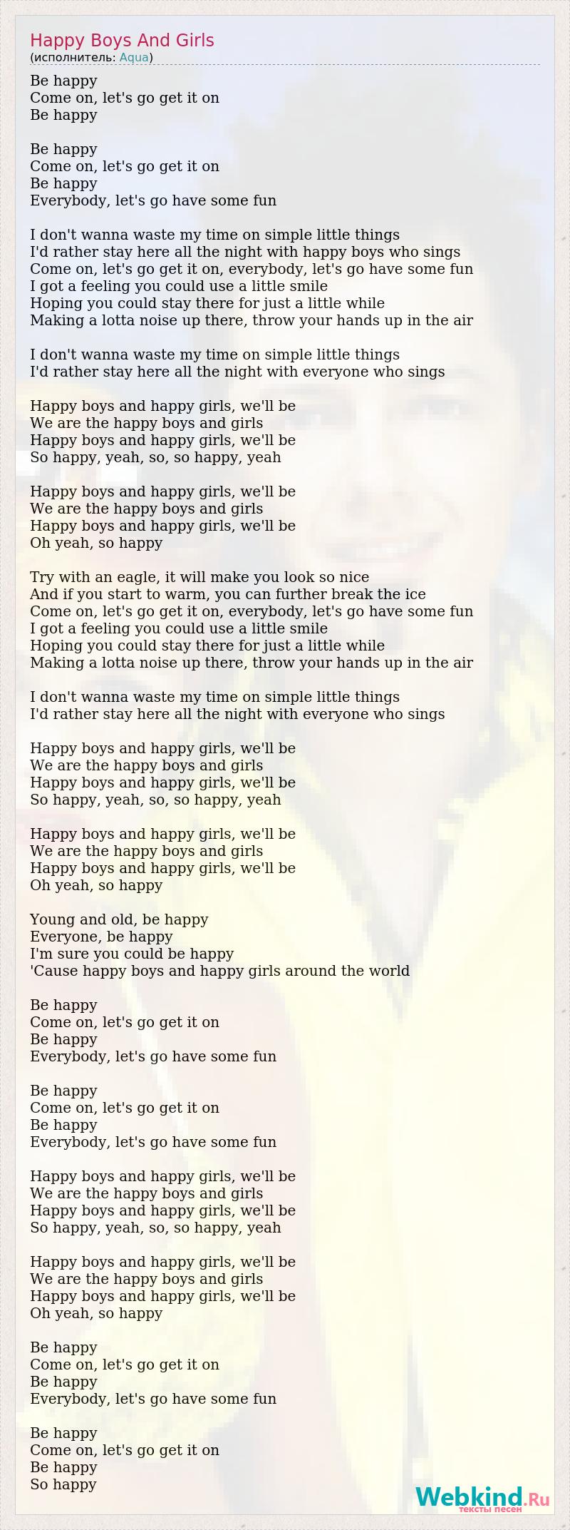 Be happy Come on, let's go get it on Be happy Be happy Come on, let's go get it on Be happy Everybody, let's go have some fun I don't wanna waste my time on simple little things I'd rather stay here all the night with happy boys who sings Come on, let's go get it on, everybody, let's go have some fun I got a feeling you could use a little smile Hoping you could stay there for just a little while Making a lotta noise up there, throw your hands up in the air I don't wanna waste my time on simple little things I'd rather stay here all the night with everyone who sings Happy boys and happy girls, we'll be We are the happy boys and girls Happy boys and happy girls, we'll be So happy, yeah, so, so happy, yeah Happy boys and happy girls, we'll be We are the happy boys and girls Happy boys and happy girls, we'll be Oh yeah, so happy Try with an eagle, it will make you look so nice And if you start to warm, you can further break the ice Come on, let's go get it on, everybody, let's go have some fun I got a feeling you could use a little smile Hoping you could stay there for just a little while Making a lotta noise up there, throw your hands up in the air I don't wanna waste my time on simple little things I'd rather stay here all the night with everyone who sings Happy boys and happy girls, we'll be We are the happy boys and girls Happy boys and happy girls, we'll be So happy, yeah, so, so happy, yeah Happy boys and happy girls, we'll be We are the happy boys and girls Happy boys and happy girls, we'll be Oh yeah, so happy Young and old, be happy Everyone, be happy I'm sure you could be happy 'Cause happy boys and happy girls around the world Be happy Come on, let's go get it on Be happy Everybody, let's go have some fun Be happy Come on, let's go get it on Be happy Everybody, let's go have some fun Happy boys and happy girls, we'll be We are the happy boys and girls Happy boys and happy girls, we'll be So happy, yeah, so, so happy, yeah Happy boys and happy girls, we'll be We are the happy boys and girls Happy boys and happy girls, we'll be Oh yeah, so happy Be happy Come on, let's go get it on Be happy Everybody, let's go have some fun Be happy Come on, let's go get it on Be happy So happy