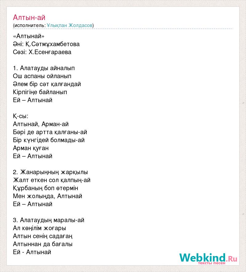 «Алтынай» Әні: Қ.Сәтмұхамбетова Сөзі: Х.Есенғараева 1. Алатауды айналып Ош аспаны ойланып Әлем бір сәт қалғандай Кірпігіңе байланып Ей – Алтынай Қ-сы: Алтынай, Арман-ай Бәрі де артта қалғаны-ай Бір күнгідей болмады-ай Арман қуған Ей – Алтынай 2. Жанарыңның жарқылы Жалт еткен сол қалпың-ай Құрбаның боп өтермін Мен жолыңда, Алтынай Ей – Алтынай 3. Алатаудың маралы-ай Ал көңілім жоғары Алтын сенің садағаң Алтыннан да бағалы Ей - Алтынай