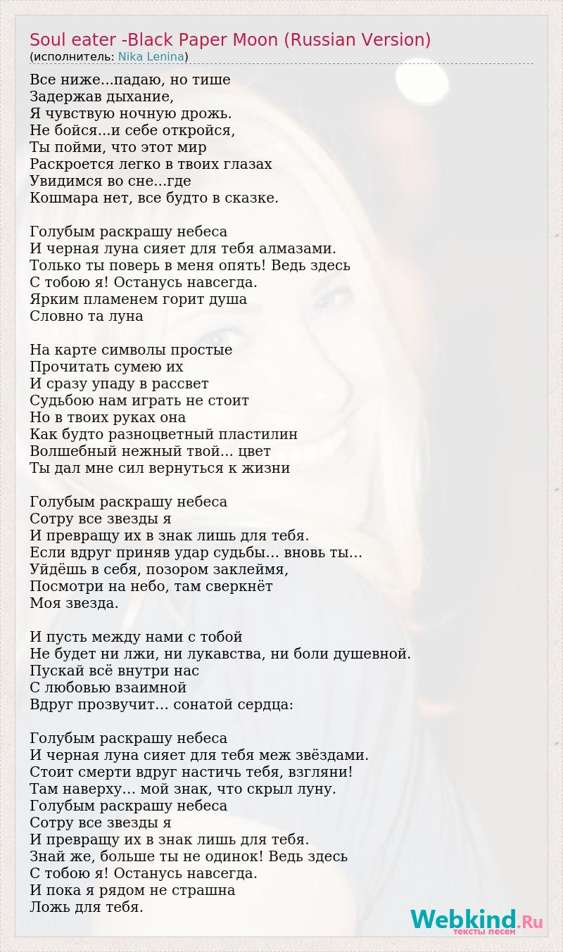 Все ниже...падаю, но тише Задержав дыхание, Я чувствую ночную дрожь. Не бойся...и себе откройся, Ты пойми, что этот мир Раскроется легко в твоих глазах Увидимся во сне...где Кошмара нет, все будто в сказке. Голубым раскрашу небеса И черная луна сияет для тебя алмазами. Только ты поверь в меня опять! Ведь здесь С тобою я! Останусь навсегда. Ярким пламенем горит душа Словно та луна На карте символы простые Прочитать сумею их И сразу упаду в рассвет Судьбою нам играть не стоит Но в твоих руках она Как будто разноцветный пластилин Волшебный нежный твой... цвет Ты дал мне сил вернуться к жизни Голубым раскрашу небеса Сотру все звезды я И превращу их в знак лишь для тебя. Если вдруг приняв удар судьбы… вновь ты… Уйдёшь в себя, позором заклеймя, Посмотри на небо, там сверкнёт Моя звезда. И пусть между нами с тобой Не будет ни лжи, ни лукавства, ни боли душевной. Пускай всё внутри нас С любовью взаимной Вдруг прозвучит… сонатой сердца: Голубым раскрашу небеса И черная луна сияет для тебя меж звёздами. Стоит смерти вдруг настичь тебя, взгляни! Там наверху… мой знак, что скрыл луну. Голубым раскрашу небеса Сотру все звезды я И превращу их в знак лишь для тебя. Знай же, больше ты не одинок! Ведь здесь С тобою я! Останусь навсегда. И пока я рядом не страшна Ложь для тебя.