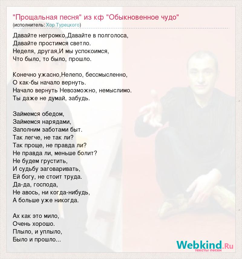 Давайте негромко,Давайте в полголоса, Давайте простимся светло. Неделя, другая,И мы успокоимся, Что было, то было, прошло. Конечно ужасно,Нелепо, бессмысленно, О как-бы начало вернуть. Начало вернуть Невозможно, немыслимо. Ты даже не думай, забудь. Займемся обедом, Займемся нарядами, Заполним заботами быт. Так легче, не так ли? Так проще, не правда ли? Не правда ли, меньше болит? Не будем грустить, И судьбу заговаривать, Ей богу, не стоит труда. Да-да, господа, Не авось, ни когда-нибудь, А больше уже никогда. Ах как это мило, Очень хорошо. Плыло, и уплыло, Было и прошло...