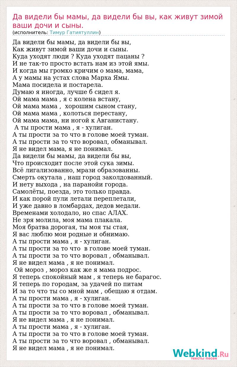 Да видели бы мамы, да видели бы вы, Как живут зимой ваши дочи и сыны. Куда уходят люди ? Куда уходят пацаны ? И не так-то просто встать нам из этой ямы. И когда мы громко кричим о мама, мама, А у мамы на устах слова Марха Ямы. Мама посидела и постарела. Думаю я иногда, лучше б сидел я. Ой мама мама , я с колена встану, Ой мама мама , хорошим сыном стану, Ой мама мама , колоться перестану, Ой мама мама, ни ногой к Авганистану. А ты прости мама , я - хулиган. А ты прости за то что в голове моей туман. А ты прости за то что воровал, обманывал. Я не видел мама, я не понимал. Да видели бы мамы, да видели бы вы, Что происходит после этой сука зимы. Всё лигализованно, мрази образованны. Смерть окутала , наш город заколдованный. И нету выхода , на паранойи города. Самолёты, поезда, это только правда. И как порой пули летали переплетали, И уже давно в ломбардах, дедов медали. Временами холодало, но спас АЛАХ. Не зря молила, моя мама плакала. Моя братва дорогая, ты моя ты стая, Я вас люблю мои родные и обнимаю. А ты прости мама , я - хулиган. А ты прости за то что в голове моей туман. А ты прости за то что воровал , обманывал. Я не видел мама , я не понимал. Ой мороз , мороз как же я мама подрос. Я теперь спокойный мам , я теперь не барагос. Я теперь по городам, за удачей по питам И за то что ты со мной мам , обещаю я отдам. А ты прости мама , я - хулиган. А ты прости за то что в голове моей туман. А ты прости за то что воровал , обманывал. Я не видел мама , я не понимал. А ты прости мама , я - хулиган. А ты прости за то что в голове моей туман. А ты прости за то что воровал , обманывал. Я не видел мама , я не понимал.