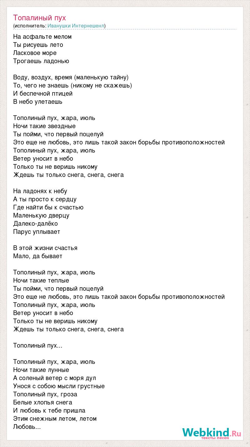 На асфальте мелом Ты рисуешь лето Ласковое море Трогаешь ладонью Воду, воздух, время (маленькую тайну) То, чего не знаешь (никому не скажешь) И беспечной птицей В небо улетаешь Тополиный пух, жара, июль Ночи такие звездные Ты пойми, что первый поцелуй Это еще не любовь, это лишь такой закон борьбы противоположностей Тополиный пух, жара, июль Ветер уносит в небо Только ты не веришь никому Ждешь ты только снега, снега, снега На ладонях к небу А ты просто к сердцу Где найти бы к счастью Маленькую дверцу Далеко-далёко Парус уплывает В этой жизни счастья Мало, да бывает Тополиный пух, жара, июль Ночи такие теплые Ты пойми, что первый поцелуй Это еще не любовь, это лишь такой закон борьбы противоположностей Тополиный пух, жара, июль Ветер уносит в небо Только ты не веришь никому Ждешь ты только снега, снега, снега Тополиный пух... Тополиный пух, жара, июль Ночи такие лунные А соленый ветер с моря дул Унося с собою мысли грустные Тополиный пух, гроза Белые хлопья снега И любовь к тебе пришла Этим снежным летом, летом Любовь...