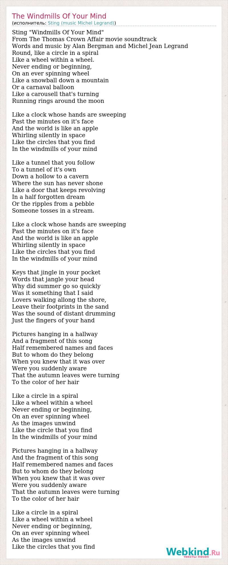 Sting "Windmills Of Your Mind" From The Thomas Crown Affair movie soundtrack Words and music by Alan Bergman and Michel Jean Legrand Round, like a circle in a spiral Like a wheel within a wheel. Never ending or beginning, On an ever spinning wheel Like a snowball down a mountain Or a carnaval balloon Like a carousell that's turning Running rings around the moon Like a clock whose hands are sweeping Past the minutes on it's face And the world is like an apple Whirling silently in space Like the circles that you find In the windmills of your mind Like a tunnel that you follow To a tunnel of it's own Down a hollow to a cavern Where the sun has never shone Like a door that keeps revolving In a half forgotten dream Or the ripples from a pebble Someone tosses in a stream. Like a clock whose hands are sweeping Past the minutes on it's face And the world is like an apple Whirling silently in space Like the circles that you find In the windmills of your mind Keys that jingle in your pocket Words that jangle your head Why did summer go so quickly Was it something that I said Lovers walking allong the shore, Leave their footprints in the sand Was the sound of distant drumming Just the fingers of your hand Pictures hanging in a hallway And a fragment of this song Half remembered names and faces But to whom do they belong When you knew that it was over Were you suddenly aware That the autumn leaves were turning To the color of her hair Like a circle in a spiral Like a wheel within a wheel Never ending or beginning, On an ever spinning wheel As the images unwind Like the circle that you find In the windmills of your mind Pictures hanging in a hallway And the fragment of this song Half remembered names and faces But to whom do they belong When you knew that it was over Were you suddenly aware That the autumn leaves were turning To the color of her hair Like a circle in a spiral Like a wheel within a wheel Never ending or beginning, On an ever spinning wheel As the images unwind Like the circles that you find
