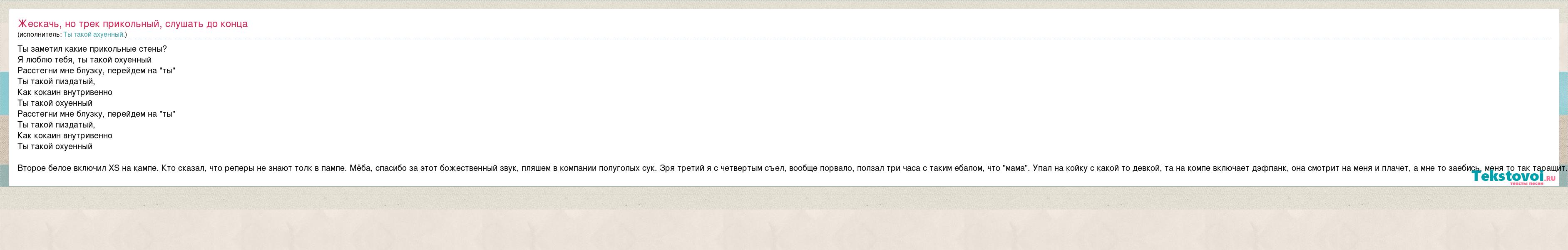 Ты заметил какие прикольные стены? Я люблю тебя, ты такой охуенный Расстегни мне блузку, перейдем на "ты" Ты такой пиздатый, Как кокаин внутривенно Ты такой охуенный Расстегни мне блузку, перейдем на "ты" Ты такой пиздатый, Как кокаин внутривенно Ты такой охуенный Второе белое включил XS на кампе. Кто сказал, что реперы не знают толк в пампе. Мёба, спасибо за этот божественный звук, пляшем в компании полуголых сук. Зря третий я с четвертым съел, вообще порвало, ползал три часа с таким ебалом, что "мама". Упал на койку с какой то девкой, та на компе включает дэфпанк, она смотрит на меня и плачет, а мне то заебись, меня то так таращит.