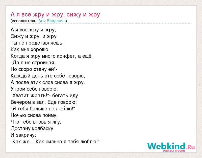 А я все жру и жру, Сижу и жру, и жру Ты не представляешь, Как мне хорошо, Когда я жру много конфет, а ещё "Да я не стройная, Но скоро стану ей"- Каждый день это себе говорю, А после этих слов снова я жру. Утром себе говорю: "Хватит жрать!"- бегать иду Вечером в зал. Еде говорю: "Я тебя больше не люблю!" Ночью снова пойму, Что тебе вновь я лгу. Достану колбаску И закричу: "Как же... Как сильно я тебя люблю!"
