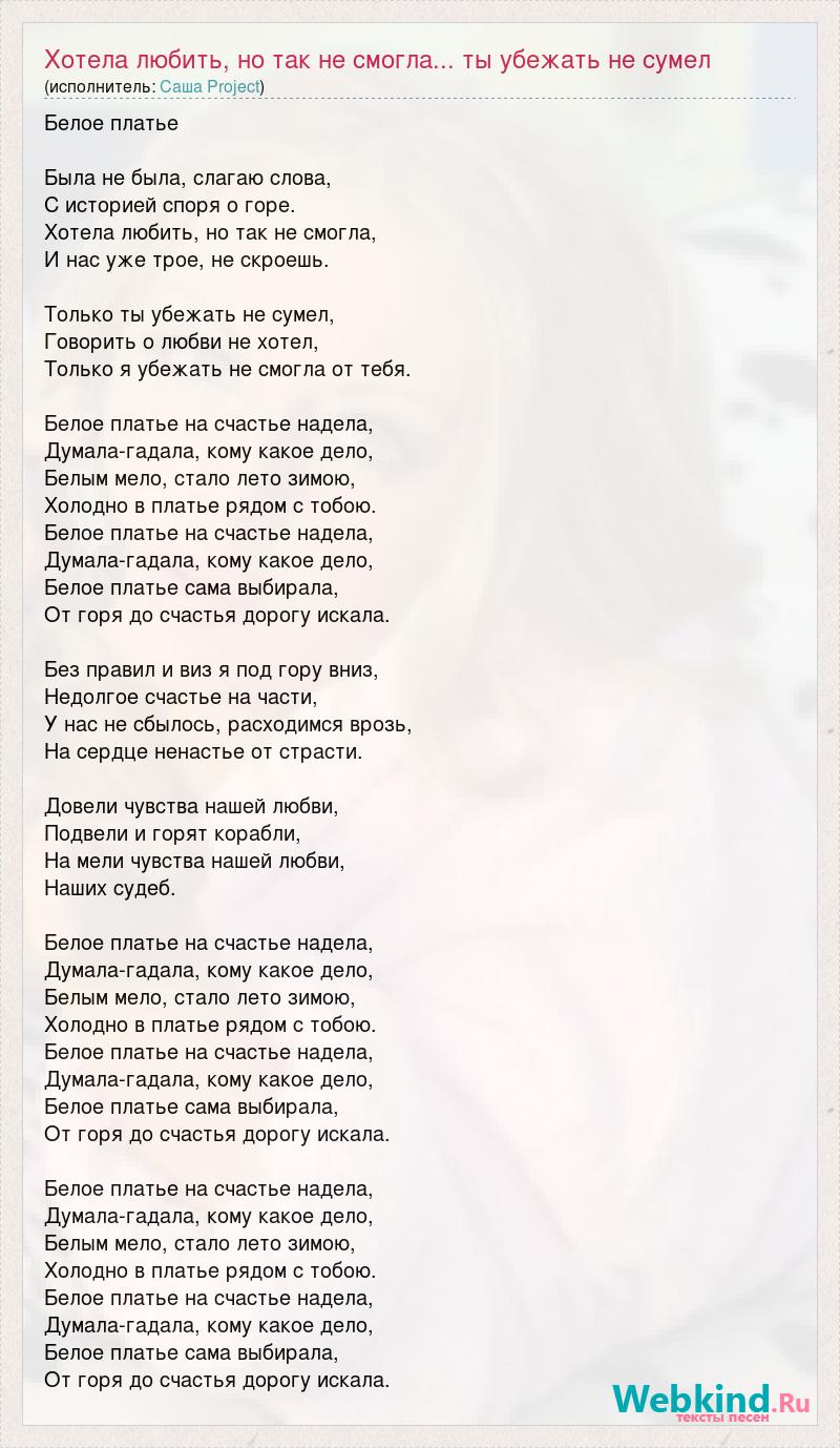 Белое платье Была не была, слагаю слова, С историей споря о горе. Хотела любить, но так не смогла, И нас уже трое, не скроешь. Только ты убежать не сумел, Говорить о любви не хотел, Только я убежать не смогла от тебя. Белое платье на счастье надела, Думала-гадала, кому какое дело, Белым мело, стало лето зимою, Холодно в платье рядом с тобою. Белое платье на счастье надела, Думала-гадала, кому какое дело, Белое платье сама выбирала, От горя до счастья дорогу искала. Без правил и виз я под гору вниз, Недолгое счастье на части, У нас не сбылось, расходимся врозь, На сердце ненастье от страсти. Довели чувства нашей любви, Подвели и горят корабли, На мели чувства нашей любви, Наших судеб. Белое платье на счастье надела, Думала-гадала, кому какое дело, Белым мело, стало лето зимою, Холодно в платье рядом с тобою. Белое платье на счастье надела, Думала-гадала, кому какое дело, Белое платье сама выбирала, От горя до счастья дорогу искала. Белое платье на счастье надела, Думала-гадала, кому какое дело, Белым мело, стало лето зимою, Холодно в платье рядом с тобою. Белое платье на счастье надела, Думала-гадала, кому какое дело, Белое платье сама выбирала, От горя до счастья дорогу искала.