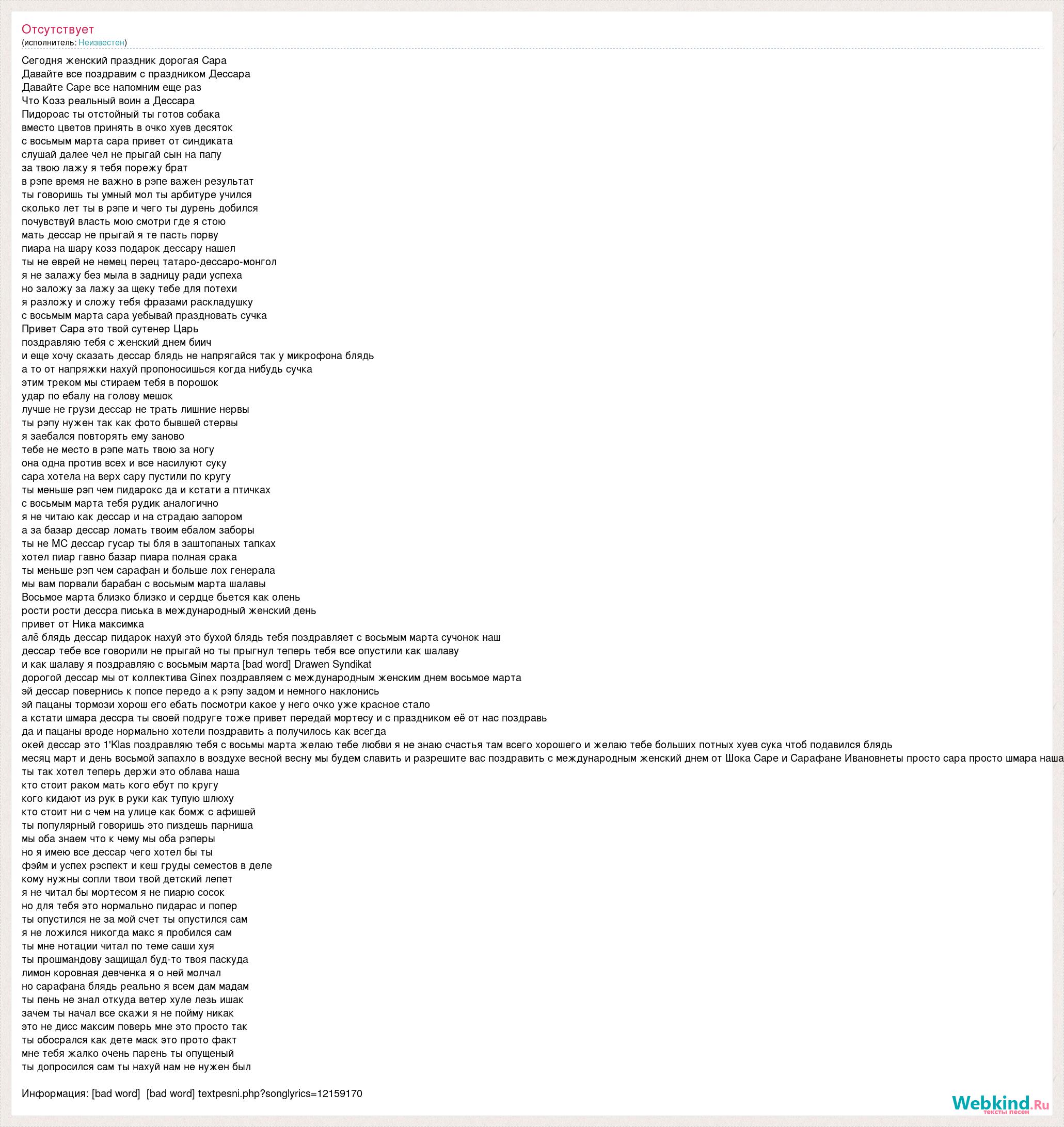 Сегодня женский праздник дорогая Сара Давайте все поздравим с праздником Дессара Давайте Саре все напомним еще раз Что Козз реальный воин а Дессара Пидороас ты отстойный ты готов собака вместо цветов принять в очко хуев десяток с восьмым марта сара привет от синдиката слушай далее чел не прыгай сын на папу за твою лажу я тебя порежу брат в рэпе время не важно в рэпе важен результат ты говоришь ты умный мол ты арбитуре учился сколько лет ты в рэпе и чего ты дурень добился почувствуй власть мою смотри где я стою мать дессар не прыгай я те пасть порву пиара на шару козз подарок дессару нашел ты не еврей не немец перец татаро-дессаро-монгол я не залажу без мыла в задницу ради успеха но заложу за лажу за щеку тебе для потехи я разложу и сложу тебя фразами раскладушку с восьмым марта сара уебывай праздновать сучка Привет Сара это твой сутенер Царь поздравляю тебя с женский днем биич и еще хочу сказать дессар блядь не напрягайся так у микрофона блядь а то от напряжки нахуй пропоносишься когда нибудь сучка этим треком мы стираем тебя в порошок удар по ебалу на голову мешок лучше не грузи дессар не трать лишние нервы ты рэпу нужен так как фото бывшей стервы я заебался повторять ему заново тебе не место в рэпе мать твою за ногу она одна против всех и все насилуют суку сара хотела на верх сару пустили по кругу ты меньше рэп чем пидарокс да и кстати а птичках с восьмым марта тебя рудик аналогично я не читаю как дессар и на страдаю запором а за базар дессар ломать твоим ебалом заборы ты не МС дессар гусар ты бля в заштопаных тапках хотел пиар гавно базар пиара полная срака ты меньше рэп чем сарафан и больше лох генерала мы вам порвали барабан с восьмым марта шалавы Восьмое марта близко близко и сердце бьется как олень рости рости дессра писька в международный женский день привет от Ника максимка алё блядь дессар пидарок нахуй это бухой блядь тебя поздравляет с восьмым марта сучонок наш дессар тебе все говорили не прыгай но ты прыгнул теперь тебя все опустили как шалаву и как шалаву я поздравляю с восьмым марта [bad word] Drawen Syndikat дорогой дессар мы от коллектива Ginex поздравляем с международным женским днем восьмое марта эй дессар повернись к попсе передо а к рэпу задом и немного наклонись эй пацаны тормози хорош его ебать посмотри какое у него очко уже красное стало а кстати шмара дессра ты своей подруге тоже привет передай мортесу и с праздником её от нас поздравь да и пацаны вроде нормально хотели поздравить а получилось как всегда окей дессар это 1'Klas поздравляю тебя с восьмы марта желаю тебе любви я не знаю счастья там всего хорошего и желаю тебе больших потных хуев сука чтоб подавился блядь месяц март и день восьмой запахло в воздухе весной весну мы будем славить и разрешите вас поздравить с международным женский днем от Шока Саре и Сарафане Ивановнеты просто сара просто шмара наша ты так хотел теперь держи это облава наша кто стоит раком мать кого ебут по кругу кого кидают из рук в руки как тупую шлюху кто стоит ни с чем на улице как бомж с афишей ты популярный говоришь это пиздешь парниша мы оба знаем что к чему мы оба рэперы но я имею все дессар чего хотел бы ты фэйм и успех рэспект и кеш груды семестов в деле кому нужны сопли твои твой детский лепет я не читал бы мортесом я не пиарю сосок но для тебя это нормально пидарас и попер ты опустился не за м