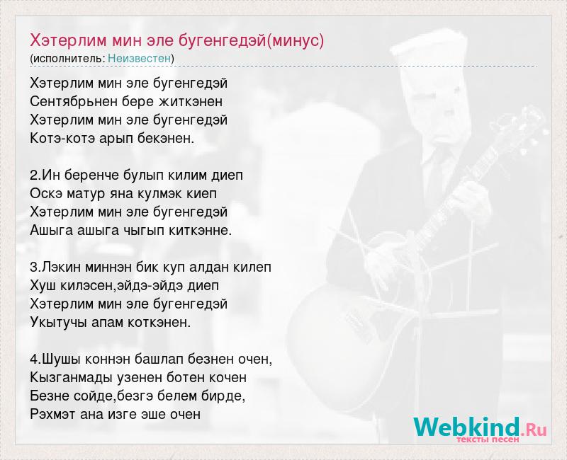 Хэтерлим мин эле бугенгедэй Сентябрьнен бере житкэнен Хэтерлим мин эле бугенгедэй Котэ-котэ арып бекэнен. 2.Ин беренче булып килим диеп Оскэ матур яна кулмэк киеп Хэтерлим мин эле бугенгедэй Ашыга ашыга чыгып киткэнне. 3.Лэкин миннэн бик куп алдан килеп Хуш килэсен,эйдэ-эйдэ диеп Хэтерлим мин эле бугенгедэй Укытучы апам коткэнен. 4.Шушы коннэн башлап безнен очен, Кызганмады узенен ботен кочен Безне сойде,безгэ белем бирде, Рэхмэт ана изге эше очен