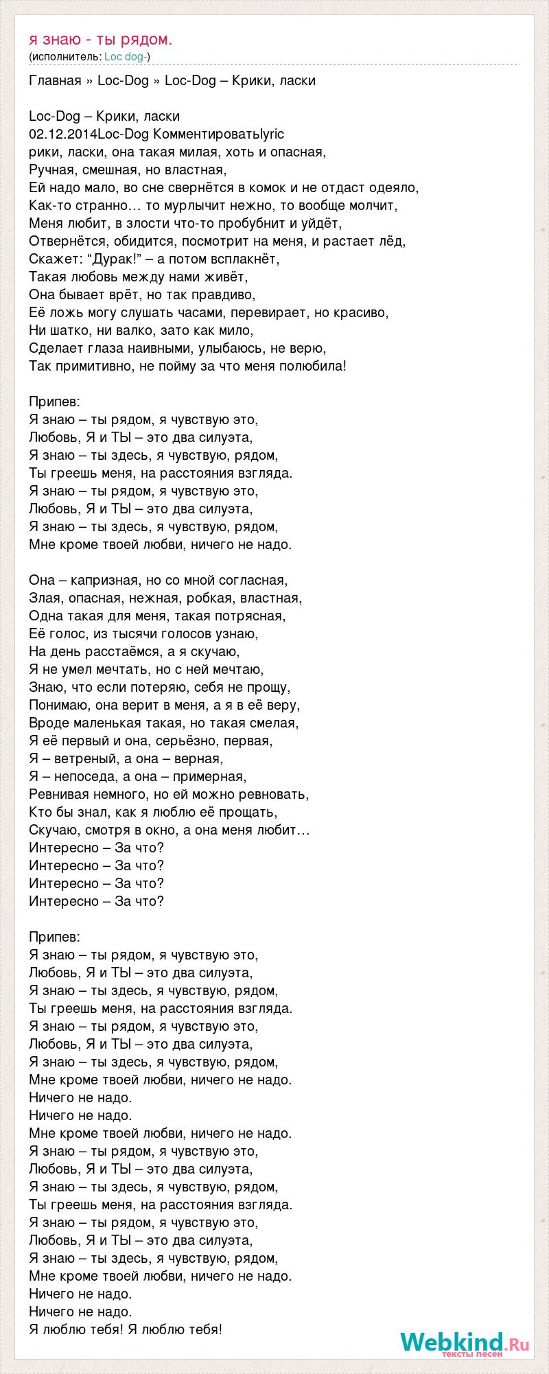 Главная » Loc-Dog » Loc-Dog – Крики, ласки Loc-Dog – Крики, ласки 02.12.2014Loc-Dog Комментироватьlyric рики, ласки, она такая милая, хоть и опасная, Ручная, смешная, но властная, Ей надо мало, во сне свернётся в комок и не отдаст одеяло, Как-то странно… то мурлычит нежно, то вообще молчит, Меня любит, в злости что-то пробубнит и уйдёт, Отвернётся, обидится, посмотрит на меня, и растает лёд, Скажет: “Дурак!” – а потом всплакнёт, Такая любовь между нами живёт, Она бывает врёт, но так правдиво, Её ложь могу слушать часами, перевирает, но красиво, Ни шатко, ни валко, зато как мило, Сделает глаза наивными, улыбаюсь, не верю, Так примитивно, не пойму за что меня полюбила! Припев: Я знаю – ты рядом, я чувствую это, Любовь, Я и ТЫ – это два силуэта, Я знаю – ты здесь, я чувствую, рядом, Ты греешь меня, на расстояния взгляда. Я знаю – ты рядом, я чувствую это, Любовь, Я и ТЫ – это два силуэта, Я знаю – ты здесь, я чувствую, рядом, Мне кроме твоей любви, ничего не надо. Она – капризная, но со мной согласная, Злая, опасная, нежная, робкая, властная, Одна такая для меня, такая потрясная, Её голос, из тысячи голосов узнаю, На день расстаёмся, а я скучаю, Я не умел мечтать, но с ней мечтаю, Знаю, что если потеряю, себя не прощу, Понимаю, она верит в меня, а я в её веру, Вроде маленькая такая, но такая смелая, Я её первый и она, серьёзно, первая, Я – ветреный, а она – верная, Я – непоседа, а она – примерная, Ревнивая немного, но ей можно ревновать, Кто бы знал, как я люблю её прощать, Скучаю, смотря в окно, а она меня любит… Интересно – За что? Интересно – За что? Интересно – За что? Интересно – За что? Припев: Я знаю – ты рядом, я чувствую это, Любовь, Я и ТЫ – это два силуэта, Я знаю – ты здесь, я чувствую, рядом, Ты греешь меня, на расстояния взгляда. Я знаю – ты рядом, я чувствую это, Любовь, Я и ТЫ – это два силуэта, Я знаю – ты здесь, я чувствую, рядом, Мне кроме твоей любви, ничего не надо. Ничего не надо. Ничего не надо. Мне кроме твоей любви, ничего не надо. Я знаю – ты рядом, я чувствую это, Любовь, Я и ТЫ – это два силуэта, Я знаю – ты здесь, я чувствую, рядом, Ты греешь меня, на расстояния взгляда. Я знаю – ты рядом, я чувствую это, Любовь, Я и ТЫ – это два силуэта, Я знаю – ты здесь, я чувствую, рядом, Мне кроме твоей любви, ничего не надо. Ничего не надо. Ничего не надо. Я люблю тебя! Я люблю тебя!