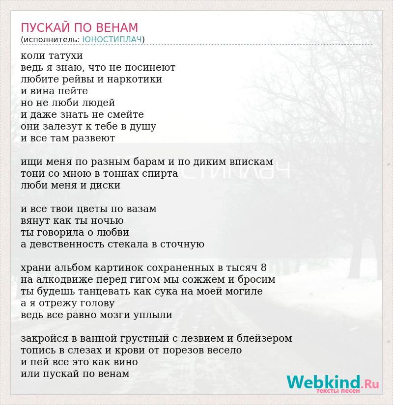 коли татухи ведь я знаю, что не посинеют любите рейвы и наркотики и вина пейте но не люби людей и даже знать не смейте они залезут к тебе в душу и все там развеют ищи меня по разным барам и по диким впискам тони со мною в тоннах спирта люби меня и диски и все твои цветы по вазам вянут как ты ночью ты говорила о любви а девственность стекала в сточную храни альбом картинок сохраненных в тысяч 8 на алкодвиже перед гигом мы сожжем и бросим ты будешь танцевать как сука на моей могиле а я отрежу голову ведь все равно мозги уплыли закройся в ванной грустный с лезвием и блейзером топись в слезах и крови от порезов весело и пей все это как вино или пускай по венам