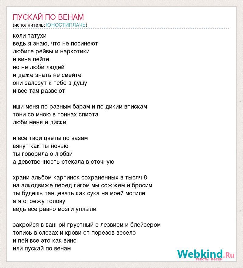коли татухи ведь я знаю, что не посинеют любите рейвы и наркотики и вина пейте но не люби людей и даже знать не смейте они залезут к тебе в душу и все там развеют ищи меня по разным барам и по диким впискам тони со мною в тоннах спирта люби меня и диски и все твои цветы по вазам вянут как ты ночью ты говорила о любви а девственность стекала в сточную храни альбом картинок сохраненных в тысяч 8 на алкодвиже перед гигом мы сожжем и бросим ты будешь танцевать как сука на моей могиле а я отрежу голову ведь все равно мозги уплыли закройся в ванной грустный с лезвием и блейзером топись в слезах и крови от порезов весело и пей все это как вино или пускай по венам