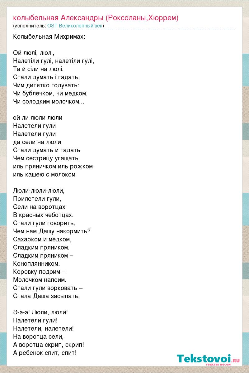 Колыбельная Михримах: Ой люлі, люлі, Налетіли гулі, налетіли гулі, Та й сіли на люлі. Стали думать і гадать, Чим дитятко годувать: Чи бублечком, чи медком, Чи солодким молочком... ой ли люли люли Налетели гули Налетели гули да сели на люли Стали думать и гадать Чем сестрицу угащать иль пряничком иль рожком иль кашею с молоком Люли-люли-люли, Прилетели гули, Сели на воротцах В красных чеботцах. Стали гули говорить, Чем нам Дашу накормить? Сахарком и медком, Сладким пряником. Сладким пряником – Коноплянником. Коровку подоим – Молочком напоим. Стали гули ворковать – Стала Даша засыпать. Э-э-э! Люли, люли! Налетели гули! Налетели, налетели! На воротца сели, А воротца скрип, скрип! А ребенок спит, спит!
