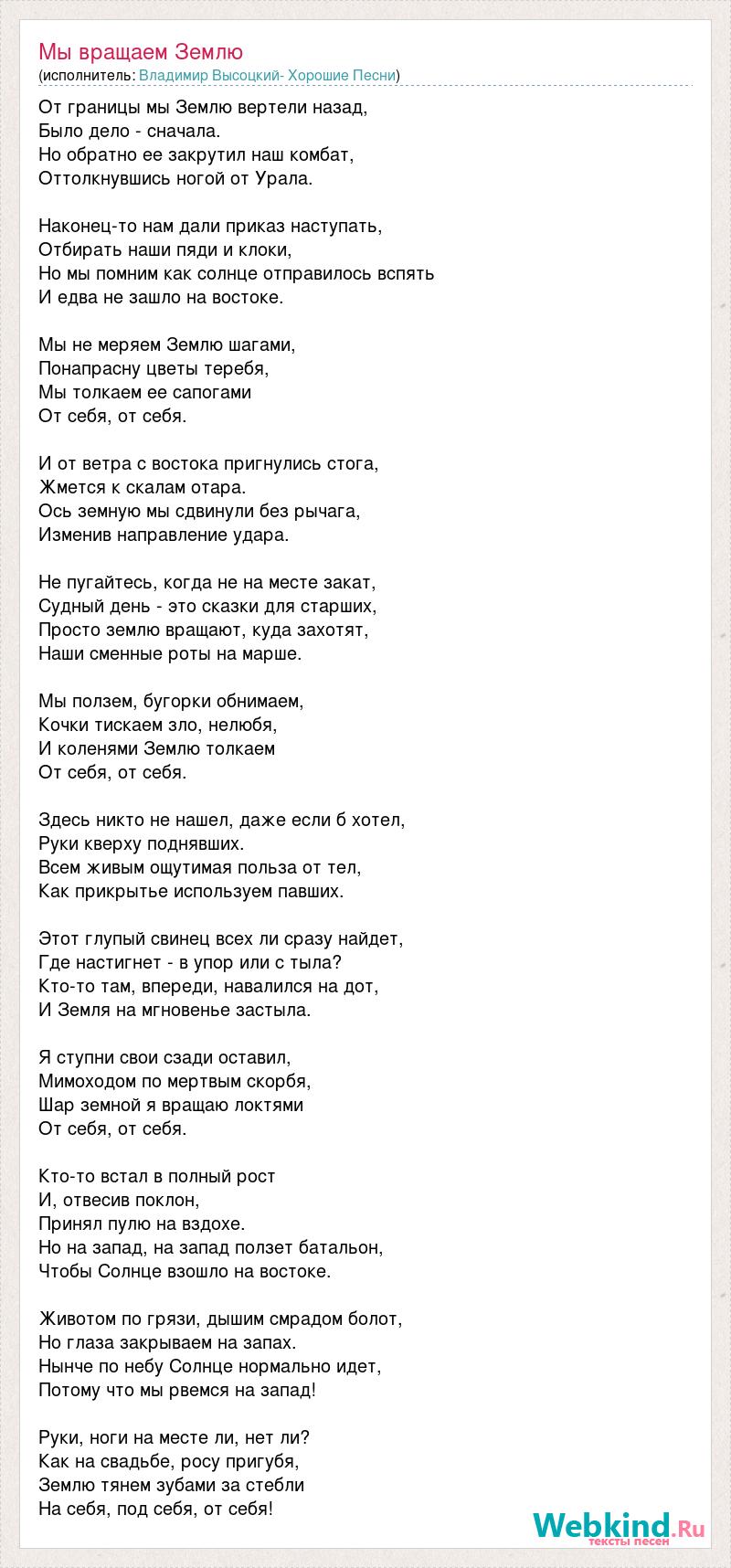 От границы мы Землю вертели назад, Было дело - сначала. Но обратно ее закрутил наш комбат, Оттолкнувшись ногой от Урала. Наконец-то нам дали приказ наступать, Отбирать наши пяди и клоки, Но мы помним как солнце отправилось вспять И едва не зашло на востоке. Мы не меряем Землю шагами, Понапрасну цветы теребя, Мы толкаем ее сапогами От себя, от себя. И от ветра с востока пригнулись стога, Жмется к скалам отара. Ось земную мы сдвинули без рычага, Изменив направление удара. Не пугайтесь, когда не на месте закат, Судный день - это сказки для старших, Просто землю вращают, куда захотят, Наши сменные роты на марше. Мы ползем, бугорки обнимаем, Кочки тискаем зло, нелюбя, И коленями Землю толкаем От себя, от себя. Здесь никто не нашел, даже если б хотел, Руки кверху поднявших. Всем живым ощутимая польза от тел, Как прикрытье используем павших. Этот глупый свинец всех ли сразу найдет, Где настигнет - в упор или с тыла? Кто-то там, впереди, навалился на дот, И Земля на мгновенье застыла. Я ступни свои сзади оставил, Мимоходом по мертвым скорбя, Шар земной я вращаю локтями От себя, от себя. Кто-то встал в полный рост И, отвесив поклон, Принял пулю на вздохе. Но на запад, на запад ползет батальон, Чтобы Солнце взошло на востоке. Животом по грязи, дышим смрадом болот, Но глаза закрываем на запах. Нынче по небу Солнце нормально идет, Потому что мы рвемся на запад! Руки, ноги на месте ли, нет ли? Как на свадьбе, росу пригубя, Землю тянем зубами за стебли На себя, под себя, от себя!