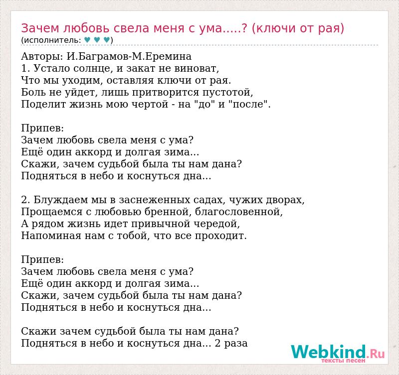 Авторы: И.Баграмов-М.Еремина 1. Устало солнце, и закат не виноват, Что мы уходим, оставляя ключи от рая. Боль не уйдет, лишь притворится пустотой, Поделит жизнь мою чертой - на "до" и "после". Припев: Зачем любовь свела меня с ума? Ещё один аккорд и долгая зима... Скажи, зачем судьбой была ты нам дана? Подняться в небо и коснуться дна... 2. Блуждаем мы в заснеженных садах, чужих дворах, Прощаемся с любовью бренной, благословенной, А рядом жизнь идет привычной чередой, Напоминая нам с тобой, что все проходит. Припев: Зачем любовь свела меня с ума? Ещё один аккорд и долгая зима... Скажи, зачем судьбой была ты нам дана? Подняться в небо и коснуться дна... Скажи зачем судьбой была ты нам дана? Подняться в небо и коснуться дна... 2 раза