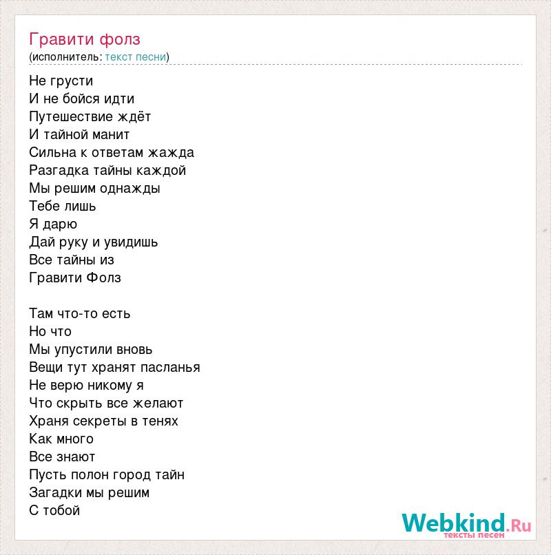 Не грусти И не бойся идти Путешествие ждёт И тайной манит Сильна к ответам жажда Разгадка тайны каждой Мы решим однажды Тебе лишь Я дарю Дай руку и увидишь Все тайны из Гравити Фолз Там что-то есть Но что Мы упустили вновь Вещи тут хранят пасланья Не верю никому я Что скрыть все желают Храня секреты в тенях Как много Все знают Пусть полон город тайн Загадки мы решим С тобой