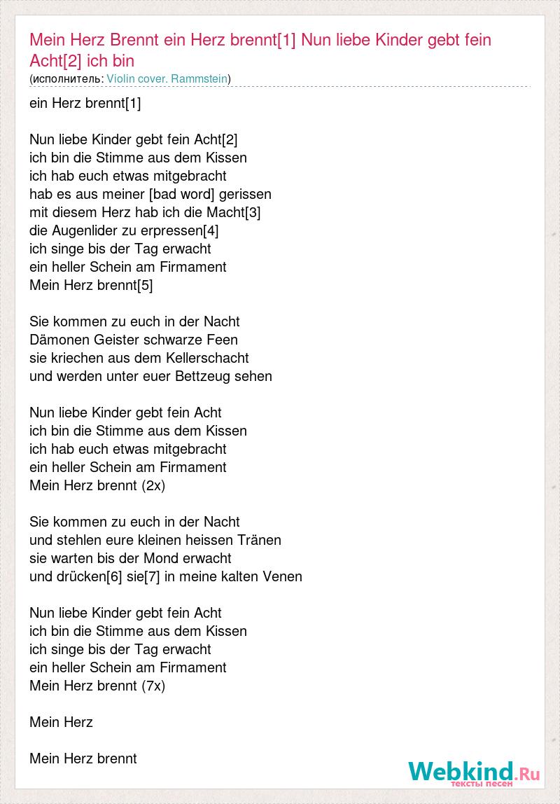 ein Herz brennt[1] Nun liebe Kinder gebt fein Acht[2] ich bin die Stimme aus dem Kissen ich hab euch etwas mitgebracht hab es aus meiner [bad word] gerissen mit diesem Herz hab ich die Macht[3] die Augenlider zu erpressen[4] ich singe bis der Tag erwacht ein heller Schein am Firmament Mein Herz brennt[5] Sie kommen zu euch in der Nacht Dämonen Geister schwarze Feen sie kriechen aus dem Kellerschacht und werden unter euer Bettzeug sehen Nun liebe Kinder gebt fein Acht ich bin die Stimme aus dem Kissen ich hab euch etwas mitgebracht ein heller Schein am Firmament Mein Herz brennt (2x) Sie kommen zu euch in der Nacht und stehlen eure kleinen heissen Tränen sie warten bis der Mond erwacht und drücken[6] sie[7] in meine kalten Venen Nun liebe Kinder gebt fein Acht ich bin die Stimme aus dem Kissen ich singe bis der Tag erwacht ein heller Schein am Firmament Mein Herz brennt (7x) Mein Herz Mein Herz brennt