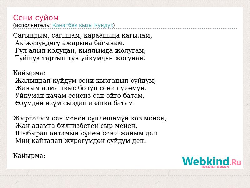 Сагындым, сагынам, карааныңа кагылам, Ак жүзүңдөгү ажарыңа багынам. Гүл алып колуңан, кыялымда жолугам, Түйшүк тартып түн уйкумдун жогунан. Кайырма: Жалындап күйдүм сени кызганып сүйдүм, Жаным алмашкыс болуп сени сүйөмүн. Уйкуман качам сенсиз сан ойго батам, Өзүмдөн өзүм сыздап азапка батам. Жыргалым сен менен сүйлөшөмүн коз менен, Жан адамга билгизбеген сыр менен, Шыбырап айтамын сүйөм сени жаным деп Миң кайталап жүрөгүмдөн сүйдүм деп. Кайырма: